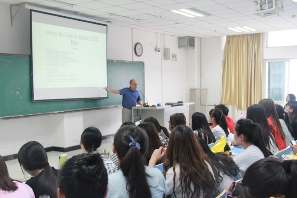 职聪结合自身经历,与同学们分享了自己从学生到商务人士、从高校讲师到美国公司首席执行官的人生经历。他告诉大家,从事商务工作应具备社会责任感,真诚待人,诚实做事,同时也要坚持不断学习,时刻做好准备,这样才能抓住人生的转折点并走向成功,收获幸福快乐的人生。他幽默的英语语言表达不时引起在场学生的阵阵掌声。讲座结束后,职聪还用英语与同学们进行了互动,回答了同学们提出的有关中西方文化差异、考研的方向、企业用人需求以及如何实现自身专业发展等方面的问题。