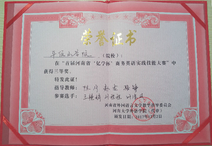 2017年12月2日,由河南省外国语言文学教学指导委员会主办,河南科技大学威廉williamhill承办的首届河南省“亿学杯”商务英语实践技能大赛在河南科技大学举行。来自我院14,15级英语专业(商务英语方向)的三名学生王艳亭、刘程程、叶深凤组成了团队,由韩福领副院长带队,代表william威廉中文参加了本次比赛。同学们在陈宁、赵龙、骆铮老师的指导下,稳定发挥、积极应对挑战,经过激烈角逐,最终荣获了本次大赛的三等奖,展现了我院商务英语专业学生扎实的语言功底和出色的商务实践能力,为学校争得了荣誉。