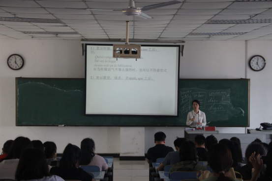 在讲座中,卢云教授首先引导大家就西班牙语中动词虚拟式的变位进行了复习,然后明确了使用虚拟式的两大的标准:一、凭句子形态判断;二、依据表达的意义判断。鉴于后者主观性太强,主要在于说话人的态度,卢云教授主要深入浅出地为大家解释了如何去通过句子形态去判断是否需要运用虚拟式。讲解之初,卢云教授先对西班牙语的句子结构进行了整理分析,着重为讲解了主从复合句中虚拟式的用法,将主从复合句分为名词性从句、副词性从句及形容词性从句,并分别进行了讲解和说明,让学生对这一语法知识有了更加系统,更加深刻的理解。最后,卢云教授也对简单句中的虚拟式用法进行了简单的总结。
