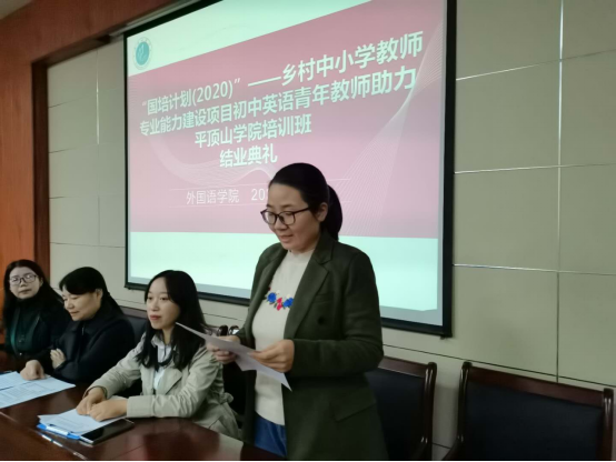 随后,孙晓晓、寇晶晶和郑栋三位老师作为优秀学员分别作了发言,孙晓晓老师表示,在本次国培培训中,专家的讲座让自己受益匪浅,不仅拓宽了自己学习的视野,还更新了自身的教育观念;寇晶晶老师和郑栋老师也指出,本次国培培训内容丰富,安排周密,在一线教师的引领下,自己找到了正确的教学方向,同时,也从他们的成功经验中获得了宝贵的教育教学方法。