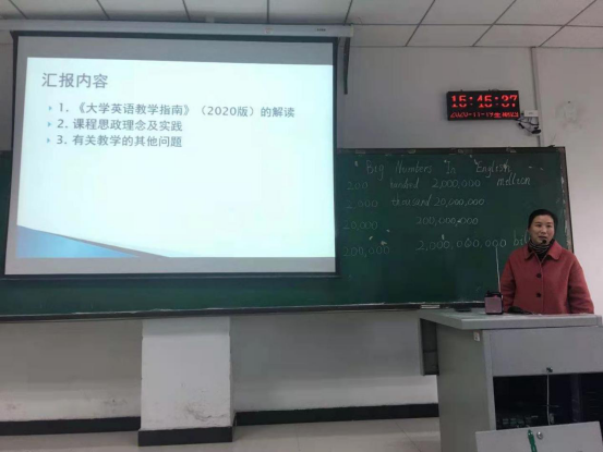 1119下午我院大学英语教研室王静老师在图书馆L601为全院教师作了题为“《大学英语教学指南(2020版)》解读与课程思政理念实施”的报告。报告由大学英语教研室主任姜慧主持全院80余名教师共同聆听。