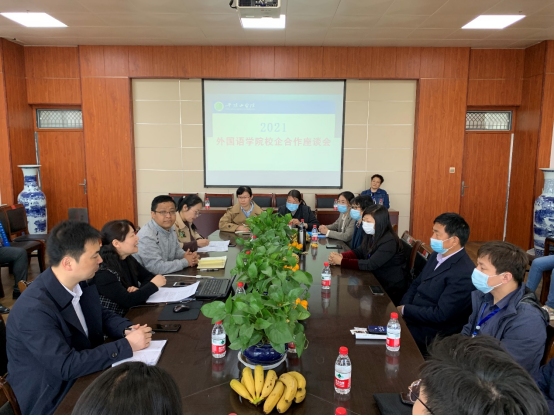 会上,蒋院长首先对各位企业代表人的到来表示了欢迎,并就近年来我院的改革发展、专业人才培养及校企合作等相关情况进行了详细介绍。她指出,我院长期以来高度重视应用型人才培养和学生实践能力的提升,“十三五”以来,我院学生多次在各级各类外语学科竞赛中获得省级以上奖励。此外,在谈到人才教育时,她特别强调,人才培养教育任重道远,还需要学校和企业加强沟通,希望同企业单位在培养复合型人才方面积极合作,实现共同发展。随后,贾院长对学院人才培养、学生就业、学科课程等方面进行了介绍,她表示,本次交流互动积极响应国家“深化产教融合、校企合作”的号召,不仅为企业招聘人才,也让校企交流更加多元化。紧接着,相关教研室主任也介绍了专业建设和办学特色。最后,参会代表分别介绍了企业的发展情况和本次招聘需求,希望能从我院招聘到更多优秀人才。双方围绕实践教学等方面开展了深入交流。