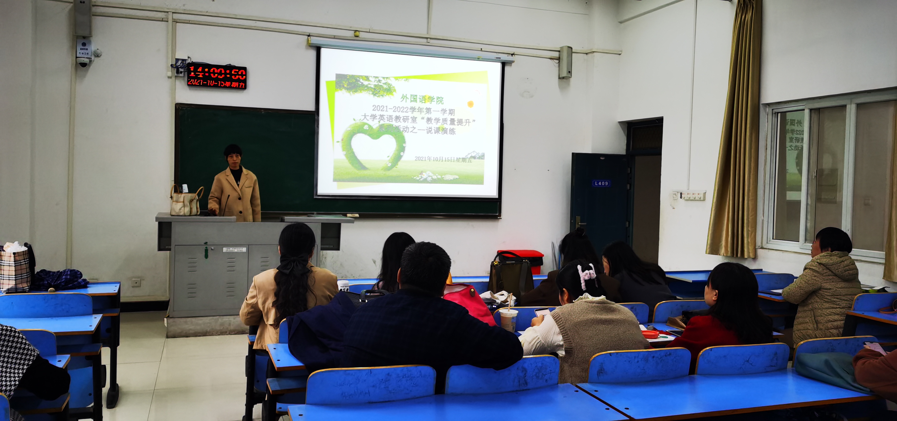 2021年10月15日星期五下午14:00,室外阴雨蒙蒙,室内热情高涨。图书馆L409教室里,威廉williamhill大学英语教研室开展了教学质量提升年系列活动之---大学英语教研室“说课演练”活动,担任普本课程的20余名大学英语任课教师参加了此次活动。围绕教学目标、教学设计、教学方法和预达到的教学效果等方面,参与此次“说课演练”的每一位教师针对一节课的授课内容进行精彩纷呈的说课。威廉williamhill副院长付琳芳、大学英语教研室的负责人和部分骨干教师担任了说课演练活动的听课教师,针对每一位教师的说课,听课教师均发表了看法,肯定好的做法的同时,对不足之处给出建议和意见。整个活动开展的非常热烈,不断有掌声传出,老师们在严肃且轻松的状态下,实现了改善、提高自身教学水平的目的。