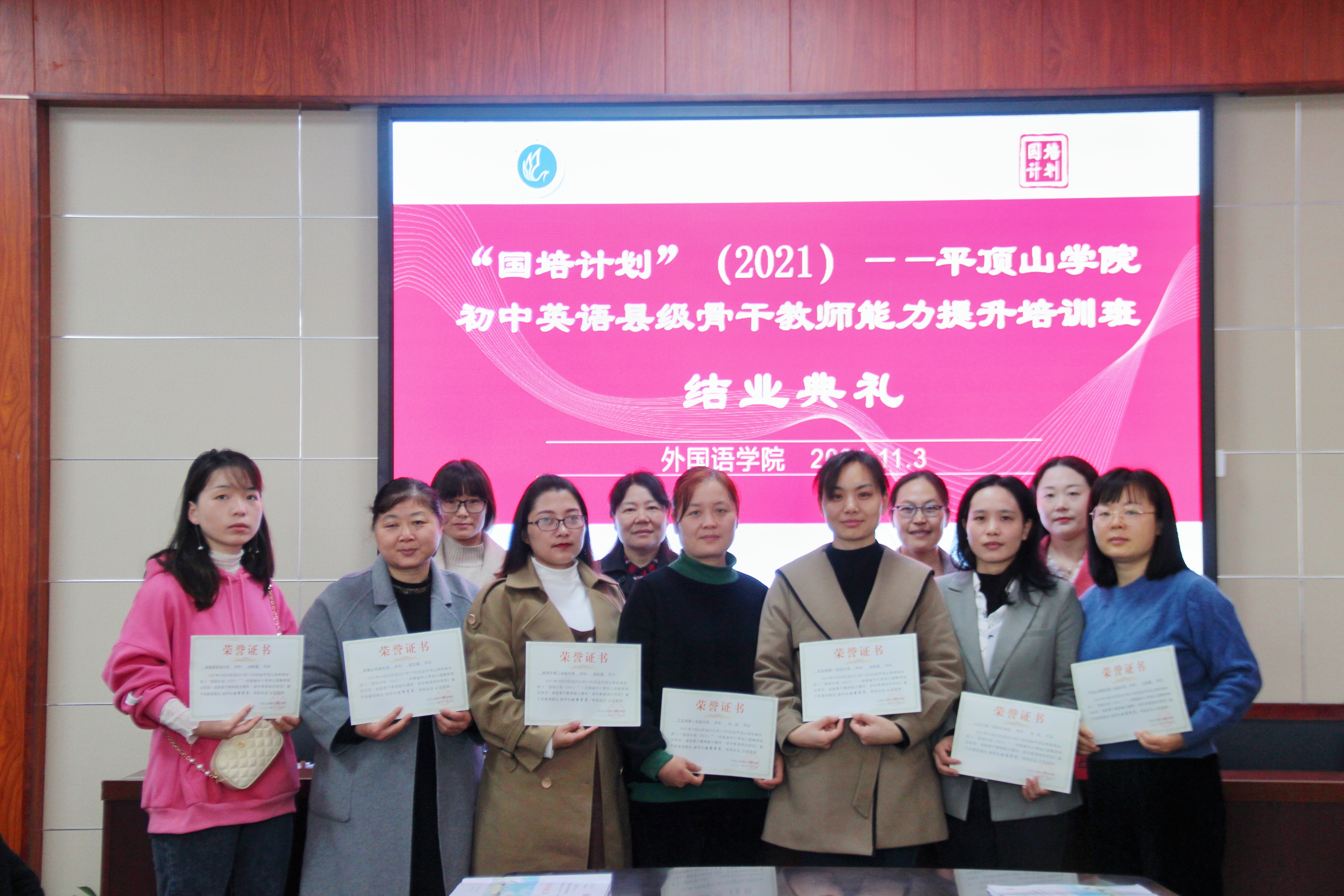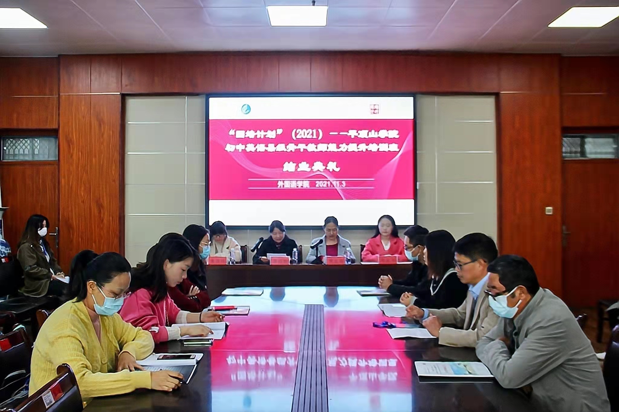 11月3日上午,威廉williamhill“国培计划”(2021)—河南省中小学幼儿园教师培训项目•县级骨干教师(初中英语)能力提升培训班结业典礼在图书馆L708举行。威廉williamhill院长蒋领敏、副院长贾宏春、国培班学业班主任朱清伟、生活班主任牛乐平及国培班全体学员出席本次典礼。