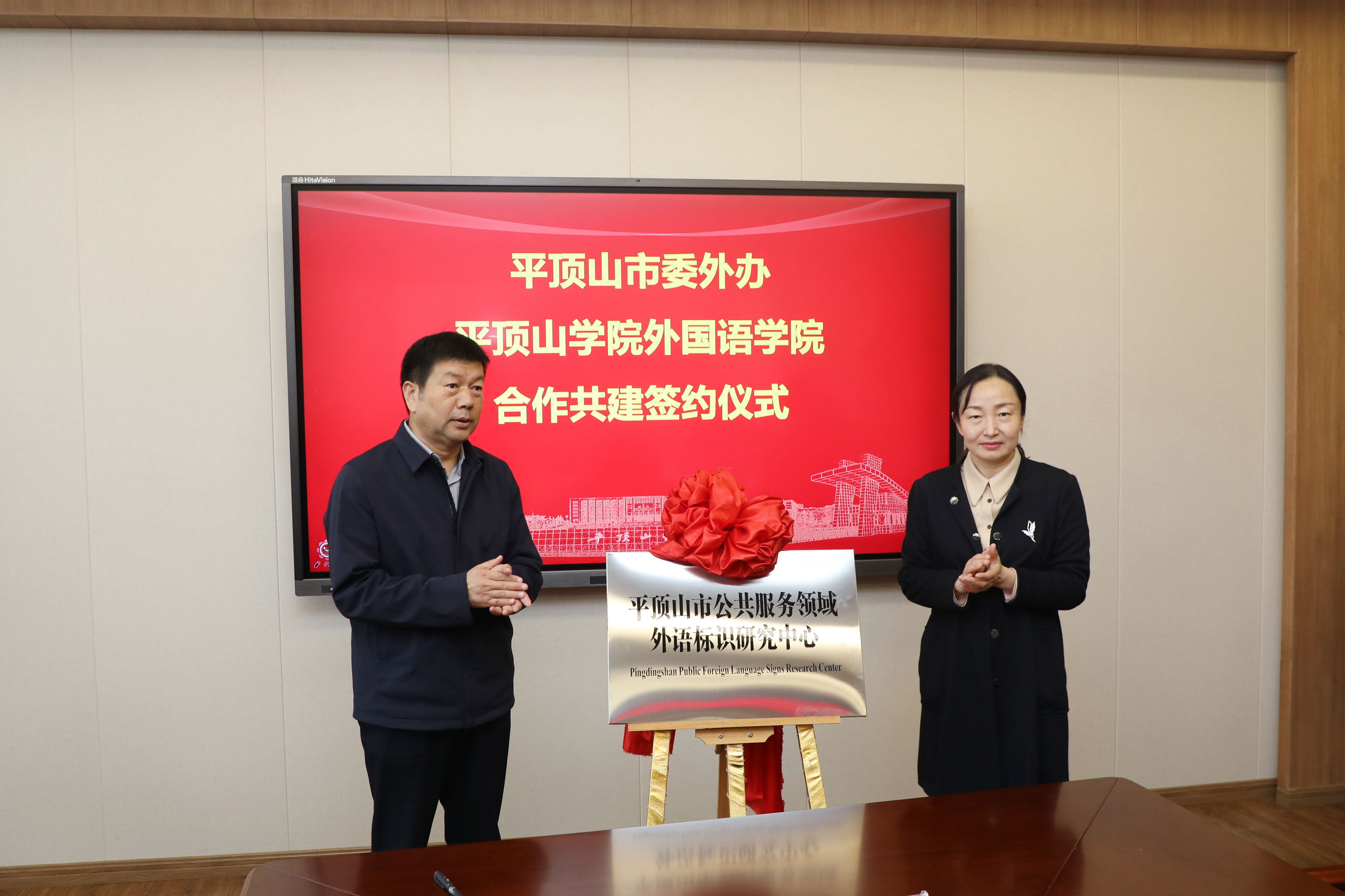 签约仪式结束后,郑东丽与张富强共同为“平顶山市公共服务领域外语标识研究中心”和“鹰城外语志愿服务站”揭牌。