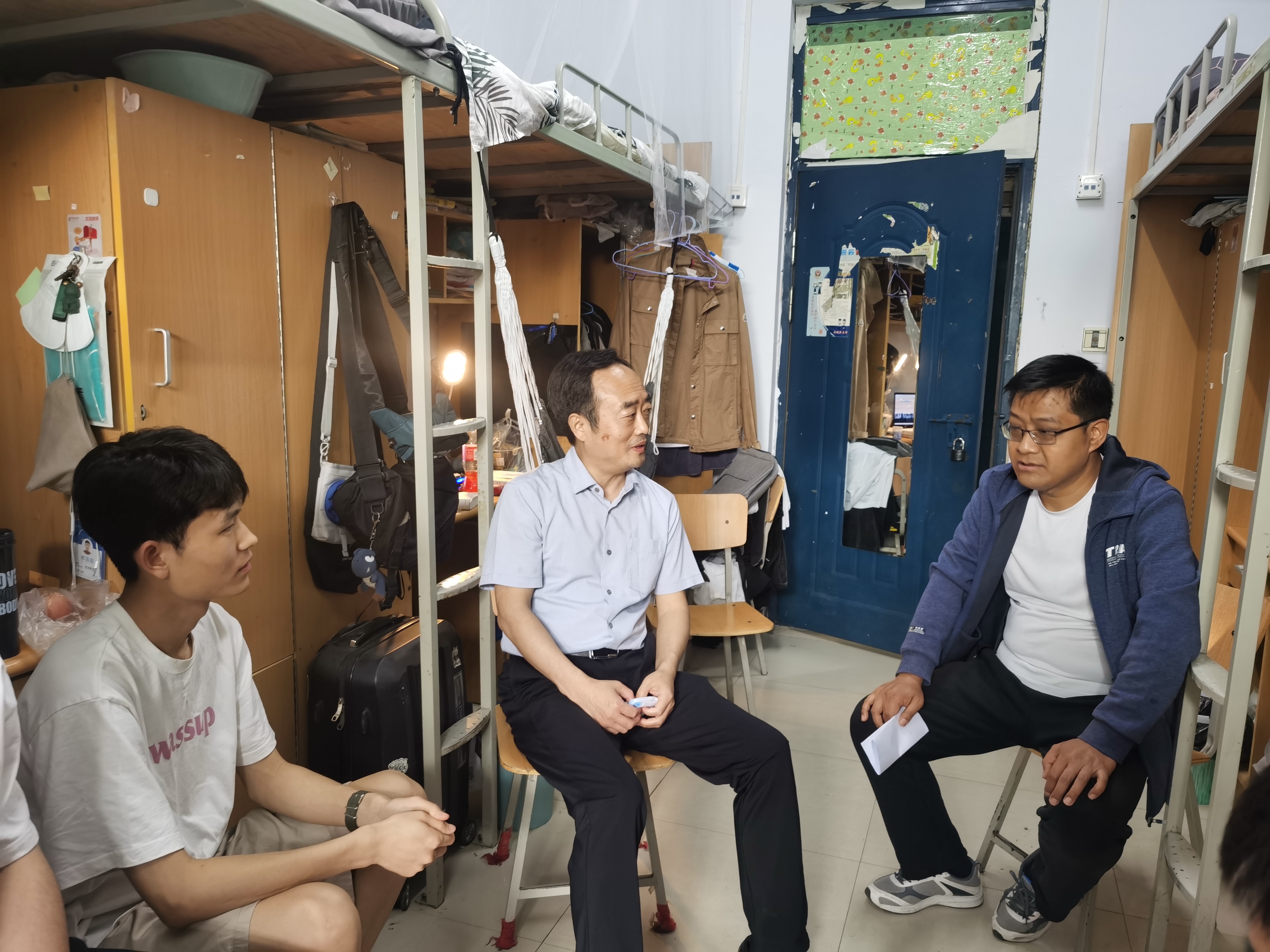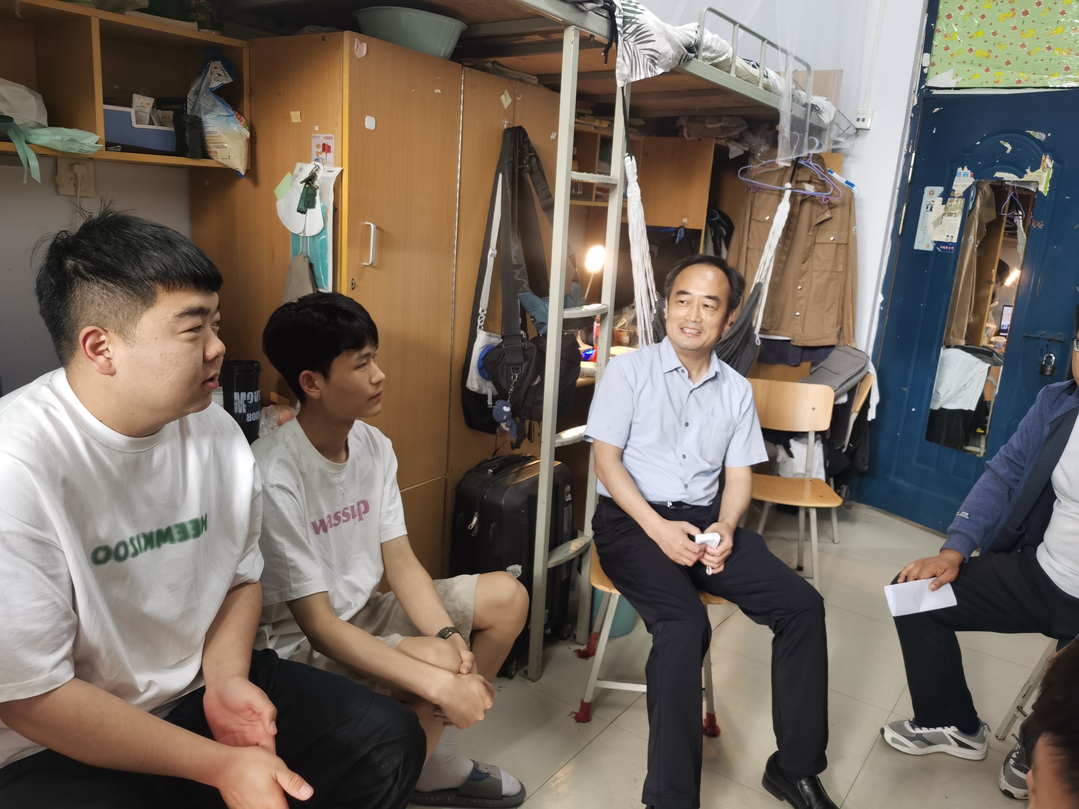 在宿舍里,张高峰与同学们亲切交谈,详细询问了同学们在学校封闭管理期间的学习、生活情况以及未来的专业发展目标。张高峰表示,在校园封闭管理的状况下,希望同学们一定要好好把握宝贵的学习时间,鼓励同学们调整好心态和学习状态,积极配合任课老师完成线上教学任务。同时,也希望同学们要规划好自己的大学阶段,努力学习专业知识,积极参加专业实践,好好学习,互相关心、互相帮助,共同进步,共同营造和谐美丽校园。张高峰叮嘱大家要严格遵守学校疫情防控要求和校规校纪,提高疫情防控责任意识,积极主动做好每日健康报备、核酸检测等常态化防疫措施,做好个人防护,养成良好的生活习惯。随后,田占范向同学们宣讲了学校当前的疫情防控政策,认真听取同学们的心声并耐心解答。同时,田占范也嘱咐同学们要增强责任意识,重视自我防护,合理进行体育锻炼,增强自身免疫力,在防疫抗疫斗争中磨炼意志、淬炼思想,配合学校共同做好疫情防控工作。最后,同学们纷纷表示,疫情面前,人人有责,将自觉遵守学校各项防疫要求,以积极的态度、良好的状态投入这段特殊时期的学习和生活中。