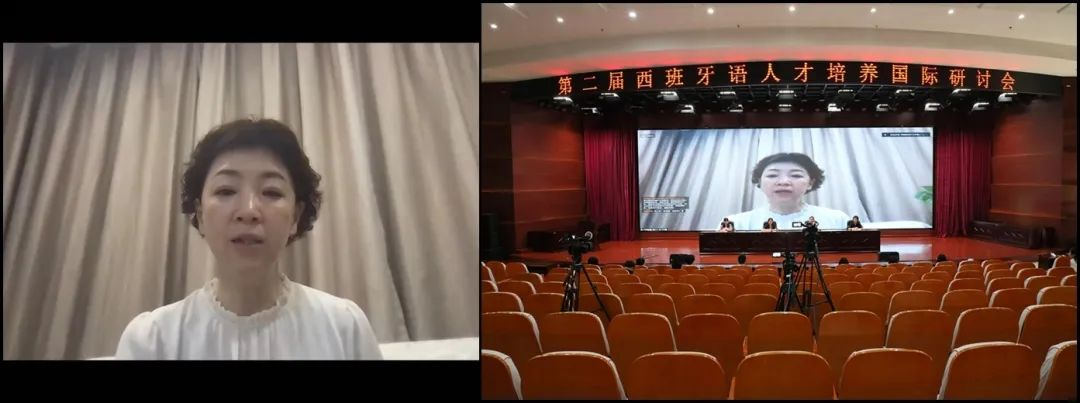 在专题研讨环节,北京外国语大学西葡语学院院长常福良教授,上海外国语大学陆经生教授,中国社会科学院拉丁美洲研究所副研究员王飞博士,对外经济贸易大学外语学院赵雪梅教授,西班牙马拉加大学对外西班牙语教学部主任阿维拉(Sara Robles Ávila)教授,马德里康普顿斯大学西班牙语教学中心副主任加尔西亚(Francisco Aliaga García)教授分别以《新文科人才培养中西班牙语教学的精与泛》《固本创新,打造新文科背景下切合国情校情的西班牙语教学体系》《高校外语学科区域国别研究的逻辑进路——智库视角》《新文科背景下西班牙语专业高年级课程设置与建设的思考》《如何高质量组织西班牙语对外教学材料 ¿Cómo crear materiales de Español como Lengua Extranjera eficaces?》《西班牙语作为外语教学的语法模块教学创新 Hacia una nueva gramática de Español como Lengua Extranjera》为题,做了主旨报告。在专题研讨中,我校威廉williamhill西班牙语专业教研室负责人孔德彪老师和外语教学与研究出版社市场编辑李姝凝老师,还就我校西班牙语专业教学与人才培养特色及西班牙语教学资源与服务等方面进行了发言。专题研讨环节由我校威廉williamhill院长蒋领敏主持。