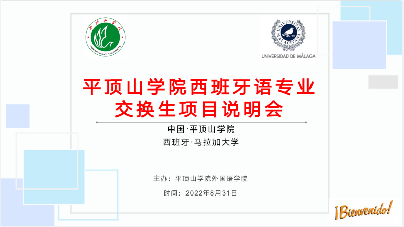 8月31日晚7点,由william威廉中文和西班牙马拉加大学联合举办的“william威廉中文西班牙语专业交换生项目说明会”在线上举行。西班牙马拉加大学国际事务处主任Juan Carlos先生与国际事务处中国学术项目负责人李璐女士,以及威廉williamhill院长蒋领敏、副院长付琳芳、西班牙语专业任课教师、辅导员、西班牙语中心老师,与威廉williamhill西语专业全体学生及家长共同参加了此次会议。本次说明会由中外项目专员邹明主持。