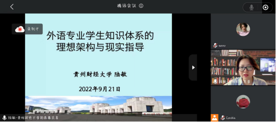 9月21日下午,应威廉williamhill邀请,贵州财经大学陆敏教授为我院师生作线上学术报告,报告题目为“外语专业学生知识体系的理想架构和现实指导”。全院100余名师生在线聆听了讲座。讲座由蒋领敏院长主持。