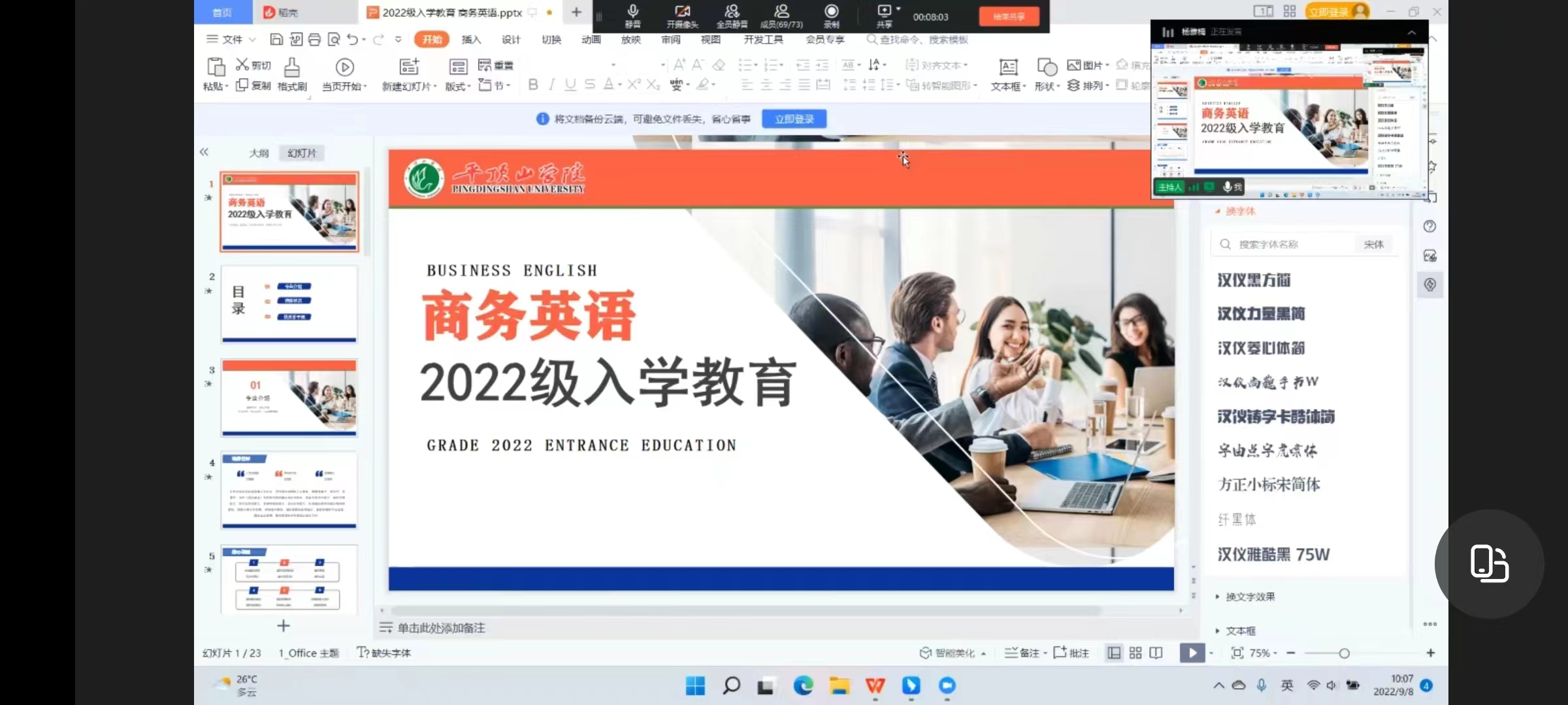 为帮助2022级商务英语专业学生尽快地了解大学生活以及商务英语专业的定位、特色、课程设置及就业方向等,9月7日上午,威廉williamhill于钉钉线上开展了商务英语专业入学教育讲座,本次讲座由2019级商务英语专业学长赵广飞主持,商务英语教研室主任骆铮,威廉williamhill商务英语专业老师杨鹏,优秀毕业生张艳茹,优秀在校生杨亚楠及全体2022级商务英语专业学生参加了此次讲座。