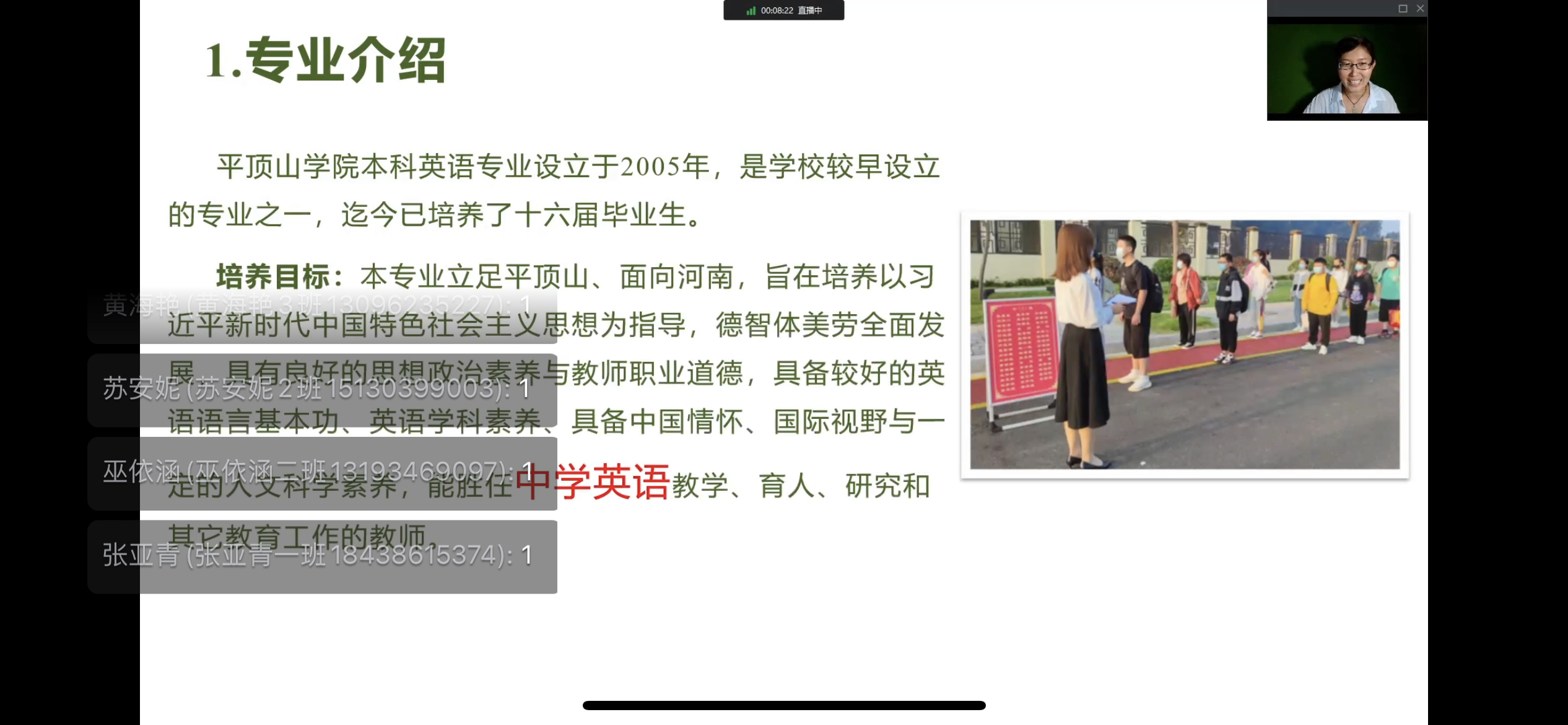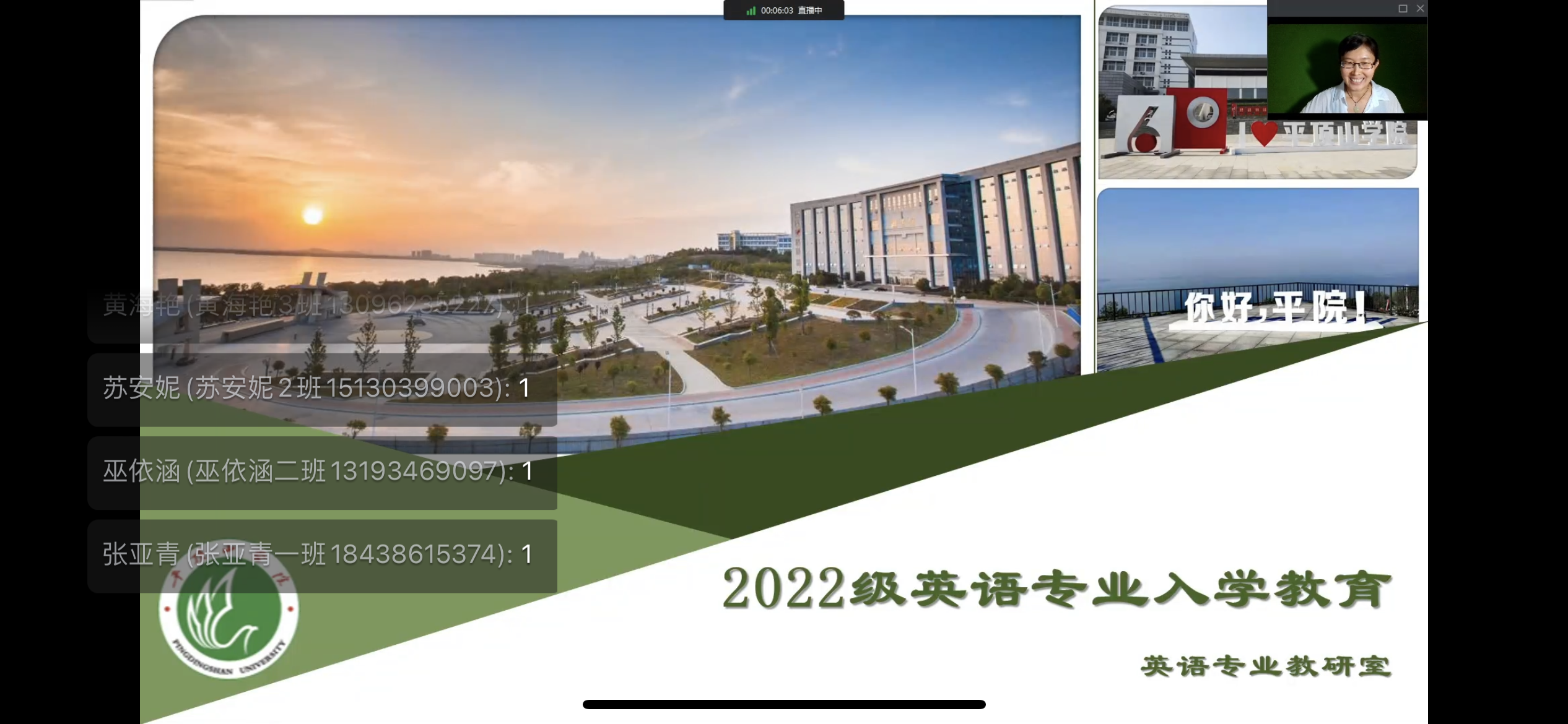 为使新生尽快适应新的学习环境,了解英语专业学习内容,更快地融入威廉williamhill大家庭,更快适应专业学习,明确专业方向前景,9月8日上午,威廉williamhill英语专业教研室通过钉钉直播、视频等形式开展2022级英语专业新生入学教育。本次讲座由威廉williamhill英语教研室主任都婧婧主持,威廉williamhill副院长贾宏春、教师孙嫚嫚、英语专业优秀毕业生代表及2022级英语专业全体新生参加。
