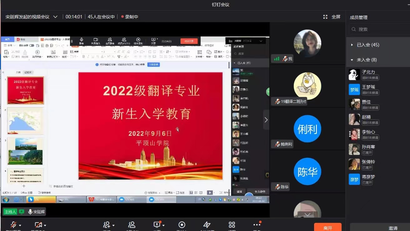 为帮助同学们提升专业认知,尽快了解翻译专业的学习目标,更好地完成角色转变,融入新生活,9月6日上午,威廉williamhill通过钉钉平台开展了2022级翻译专业新生线上入学教育,本次会议由威廉williamhill翻译教研室主任宋延辉主持,威廉williamhill翻译专业教师吴媛媛、李艳、梁雅虹,优秀毕业生李甜甜、王艳、贾紫依、优秀在校生孙悦及2022级翻译专业全体新生参加了本次会议。