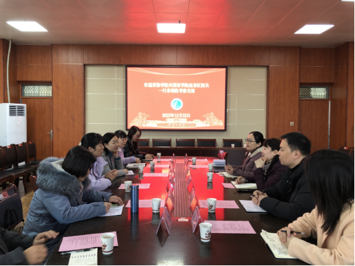 会上,蒋领敏对赵春红一行表示欢迎,双方分别对自己学院的发展历程、发展现状、近年工作成效等方面做了全面介绍。随后,双方围绕专业评价、专业认证、课堂教学改革及人才培养等方面展开了深入交流,与会人员分别就分管工作的经验和做法进行探讨和交流。双方在这次交流学习中开阔了视野和思路,相互汲取宝贵经验,在教、学、研、创等各方面进行了有益的探索。