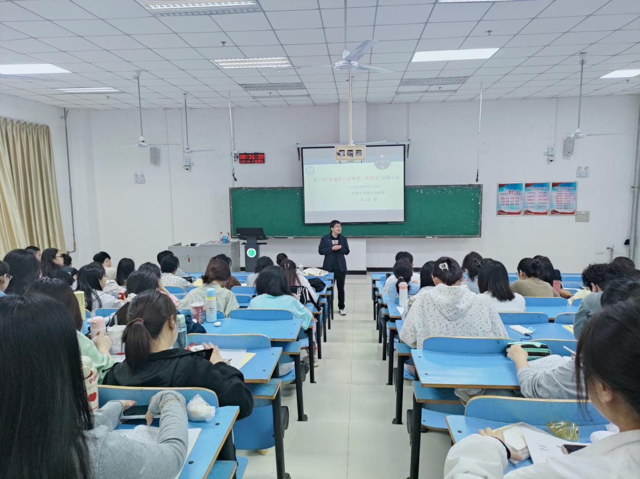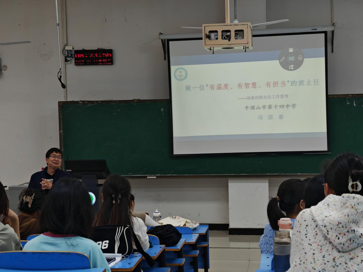2025年4月11日上午,在图书馆教室L208,威廉williamhill举办了一场英语师范生师德教育专题讲座:做幸福班主任。主讲人来自平顶山市第十四中学的冯国普老师,冯国普老师是平顶山市优秀班主任、平顶山市德育先进工作者,有着二十多年的班主任工作经验。他以典型案例从不同角度给现场师生阐释了如何做一位“有温度、有智慧、有担当”的班主任。