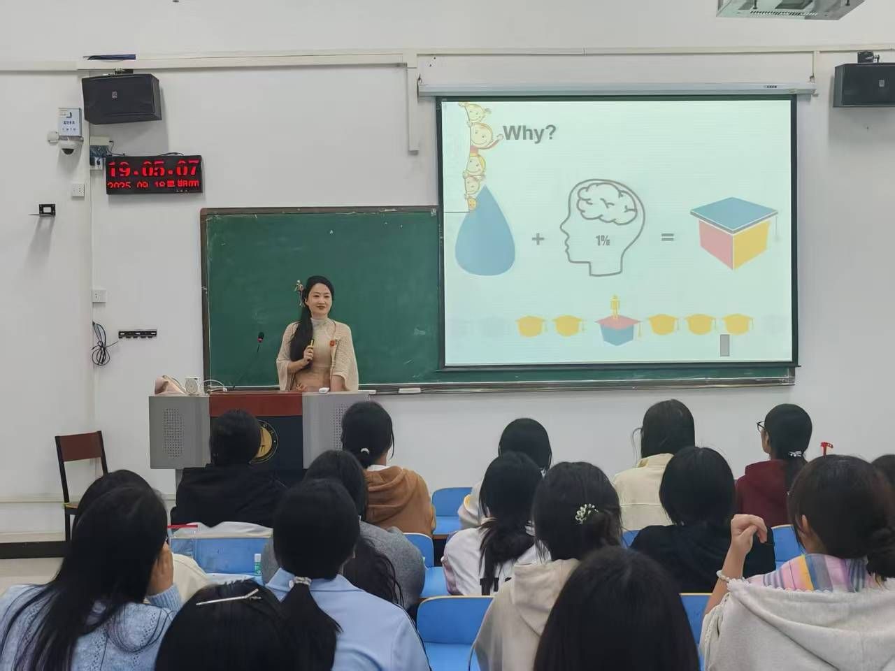 首先,赵丽对同学们的到来表示热烈欢迎,并邀请了几位专业教师与同学们见面。随后,梁雅虹简要介绍了翻译专业的培养目标和核心能力要求,并结合自身的学习与工作经历,向同学们分享了自己在专业学习上的体会与收获。接着,陈华围绕翻译专业的学习内容、学习方法以及未来发展方向进行了系统的介绍,通过梳理课程体系与能力要求,帮助同学们建立对专业学习的整体认知。介绍结束后,赵丽邀请了两位优秀毕业生代表通过提前录制视频和在线直播的方式,向同学们展示了自己在大学期间的学习生活与成长历程,分享了她们在翻译专业学习过程中的经验与感悟。优秀毕业生的生动讲述,激发了同学们对大学生活的向往与动力。最后,赵丽鼓励同学们以积极的态度迎接大学生活,明确目标,脚踏实地,在翻译专业的学习道路上不断前行。