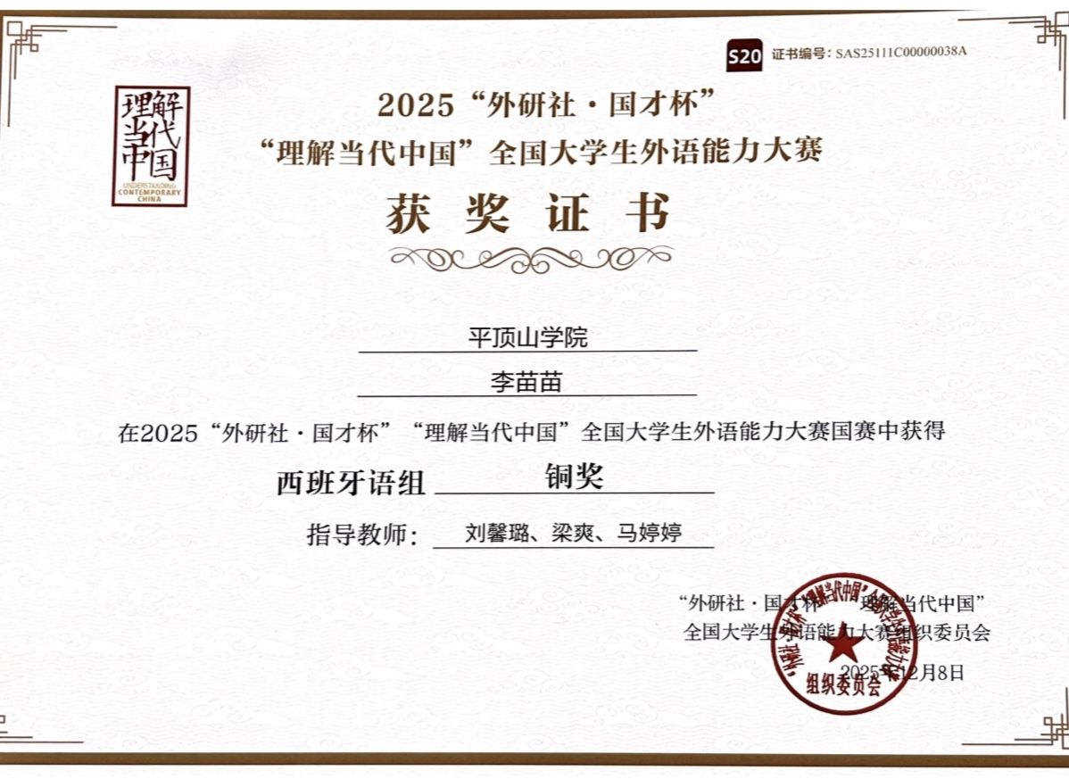 近日,2025“外研社·国才杯”“理解当代中国”全国大学生外语能力大赛多语种组赛事结果揭晓。威廉williamhill西班牙语专业学子凭借深厚语言素养、卓越综合能力及对当代中国发展的深刻理解,历史性包揽河南省赛区西语组前四名,顺利晋级全国总决赛并获国家级奖项3项,创专业参赛最佳战绩。