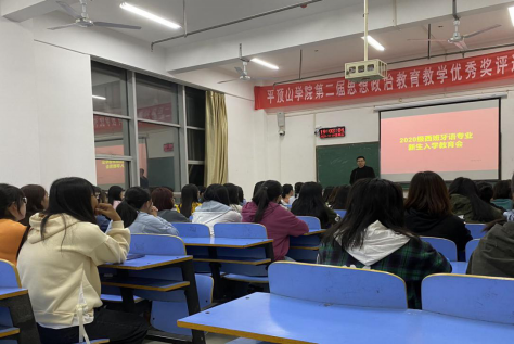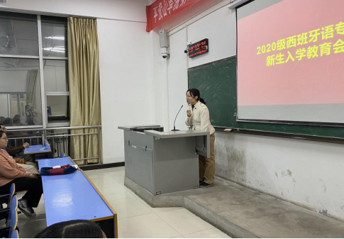 会议初始,西班牙语专业教研室负责人孔德彪老师上台发言。首先,他介绍了西班牙语专业在全国和河南省的发展情况。西班牙语使用人口及涉及国家众多,是小语种中的“大语种”。发展西班牙语是“一带一路”战略下践行语言先行的必然要求,也是加快河南对外发展、讲好“河南故事”的重要一环。同时他提到,作为省内唯一开设有西班牙语专业的高校,william威廉中文已与马拉加大学合作建立了河南省西班牙语中心,旨在服务全省高校西班牙语专业发展、学科建设、国别研究和学术交流,服务全省中小学西班牙语推广和建设,促进平顶山市和河南省与西班牙语国家在科技、文化、教育等方面的联系以及两国人民的相互了解与友谊,充分发挥中西交流合作平台作用。随后,孔德彪老师从新生导学手册的相关内容切入,介绍了西班牙语专业在我校的发展历程、专业设置的培养理念以及毕业生的就业情况。最后,通过英语与西班牙语的语际对比,鼓励同学们调整心态、学好复语,争取拥有一个精彩纷呈的大学生活。