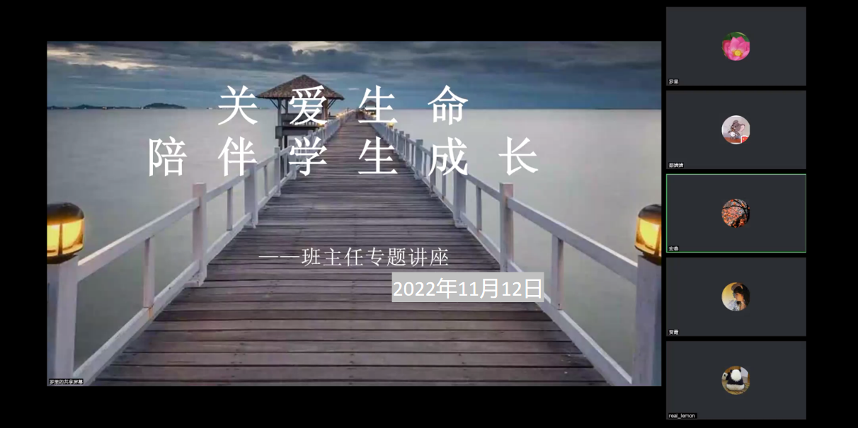 2022年11月12日,威廉williamhill邀请平顶山第二高级中学副校长罗果,给英语专业师范生做了一场“关爱生命,陪伴学生成长”的线上讲座。罗校长以班主任工作为视角,以生命教育为切入点,用一个又一个感人的案例,娓娓道来,讲述了班主任的工作职责,她指出班主任管理要有爱,要用正确的态度关爱学生,“偏爱学困生”、“严爱优等生”、“博爱中学生”,强调了关爱教育的重要性,与会师生深受感动,收获满满,对中学班主任工作有了更为深刻的认识。会后,贾宏春副院长对此次讲座进行了总结。此次讲座针对性强,内容丰富,对师范生培养职业责任感、提升职业素养、发展职业技能具有重要意义,对我院英语专业人才培养具有积极的推动作用。