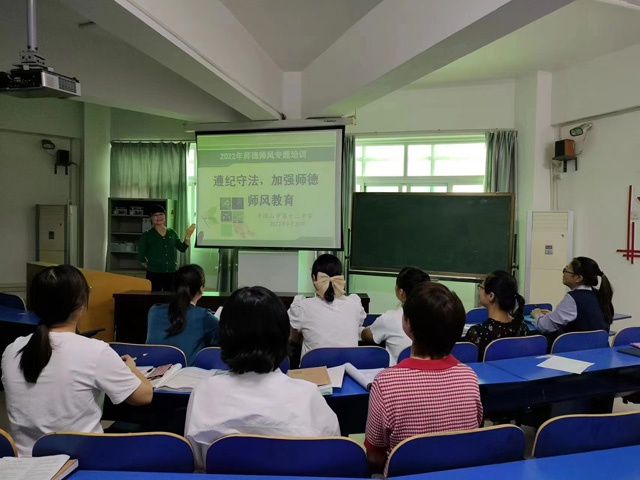 活动伊始,该校校领导对新学期师德师风建设提出具体要求,全体老师要牢记初心使命,切实落实党的教育方针,以最饱满的工作热情迎接党的二十大的召开。该校英语教研组组长对师生们就师德内容、师德现状、师德践行、师德提升四个方面进行培训学习,并鼓励大家不断加强自身的行为修养,弘扬新风正气,提高教师自身修养,树立教师高尚形象。