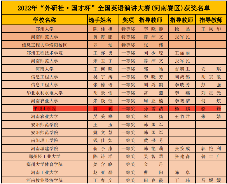 2022年11月12日,由外语教学与研究出版社主办的2022“外研社•国才杯”全国英语演讲大赛复赛落下帷幕。我院商务英语专业20级贾聪同学,不断完善自己的演讲内容,认真准备、积极应战、稳定发挥,最终在全省110多名选手中脱颖而出,喜获河南赛区一等奖,孙雪洁、杨鹏、骆铮教师团队获评优秀指导教师。