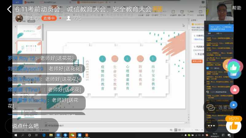 会上,田书记向同学们分享了《致全体平院学子的一封信》,向同学们传达了我校书记王文鹏、校长苏晓红对同学们的殷切祝福和嘱咐。田书记从“疫情防控教育”、“生命安全教育”、“心理健康教育”、“防溺水教育”及“出行安全教育”五大方面进行展开论述,其中谈到疫情防控,田书记向同学们简单介绍了冠状病毒的相关知识并告诫同学们要少进人堆,多戴口罩,勤加洗手。田书记指出“生命只有一次,灾祸却有无数”,他希望同学们可以努力增强安全防范意识,提高防范自救能力。同时他还告诉同学们要尊重生命,敬畏生命,拒绝野味。随后,田书记谈起这段时间同学们由于频繁的网上学习和受疫情情况的影响,产生了一定的焦虑感,希望同学们可以正确应对焦虑,合理看待疫情,防止灾难化思想。同时,他还指出同学们在网络上学习时,要积极地传播正能量,不信谣不造谣。关于溺水安全教育方面,田书记告诫同学们要牢记七“不”,将生命安全放在第一位。最后,田书记希望同学们在暑假期间做到安全出行,平安返校。