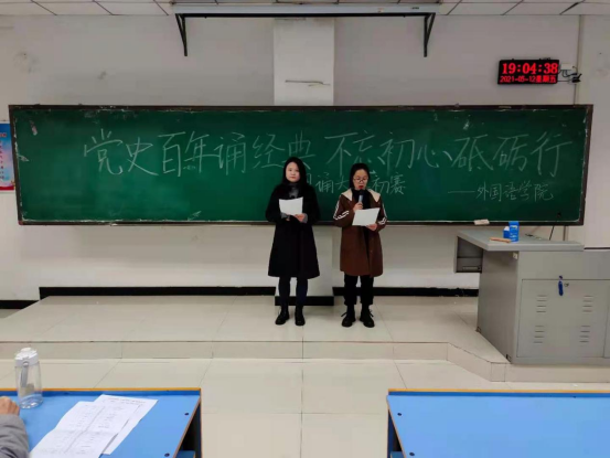在比赛中,各支参赛队伍围绕“党史百年诵经典,不忘初心砥砺行”主题进行配乐朗诵。比赛开始后,各班参赛选手依次上场,在欢呼声中展开了激烈的角逐,各展风采。朱琳同学朗诵的《火线桥》掷地有声、铿锵有力;杜宇童同学的《七月的天空》和马凡慧同学的《相信未来》让人对未来充满希望、满怀憧憬;艾菁菁和王宇同学的《不朽精神,永续传承》以及刘广杰、李佳琪同学的《中国精神》更让人敬畏红色精神。同学们精神饱满,神采奕奕,用嘹亮的声音激情诵读,歌颂伟大的党、伟大的祖国,抒发了同学们深深的爱党、爱国情怀。经过一个多小时激烈的角逐,通过评委现场评分,评选出了本次比赛的前三名。最后,评委团代表在现场公布了获奖名单,本次比赛圆满结束。