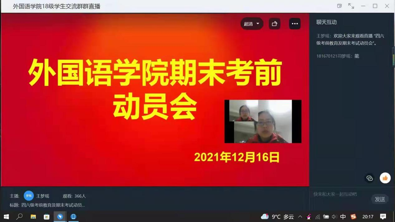 为树立学生诚信为本的道德观念,营造诚实守纪的考试氛围,进一步推进公平公正的考风考纪建设,12月16日,威廉williamhill在线上于钉钉群举行了四六级考前教育暨期末考试动员会。会议由威廉williamhill副院长贾宏春、辅导员王梦瑶主讲,威廉williamhill全体学生都参加了此次会议。