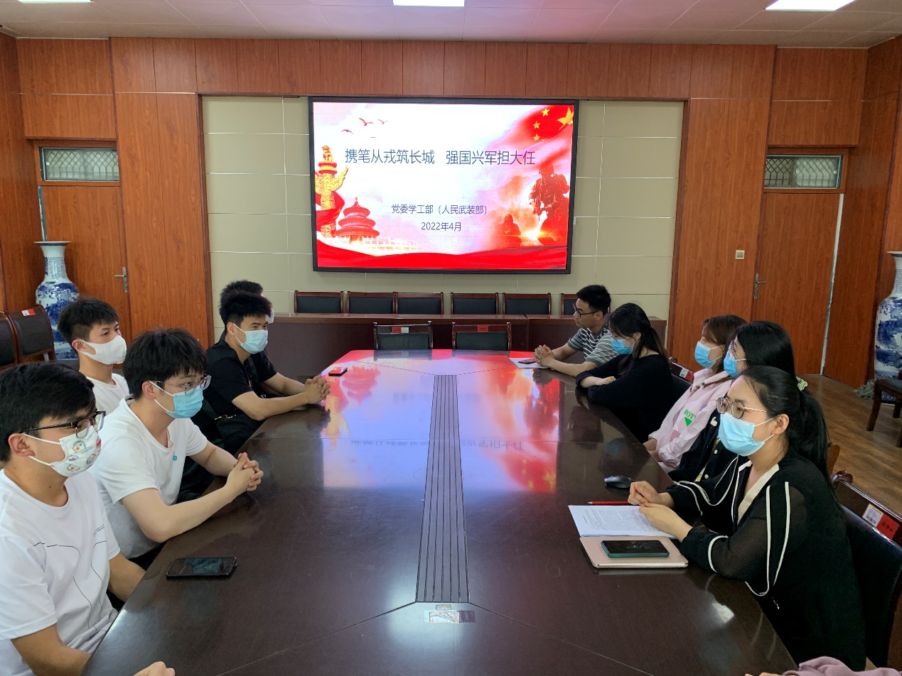 会上,王梦瑶先从优秀事例、政策、义务三个方面入手,组织同学们观看了2022的征兵宣传视频《火热军营、精彩人生》。然后,她为同学们讲解了兵役相关的法律法规,她指出,国家征兵的目的就是为了增强军队的战斗力量,需要高学历的青年学生去贡献力量。接着,王梦瑶对服兵役相关的高校优先征集、部队发展、考研加分等升学优惠等政策进行了讲解,鼓励想进一步增加自己学历的同学们踊跃参加,为自己的未来打下基础。王梦瑶还对经济补助政策进行了重点的讲解,对退役金、学费补偿、津贴费、学校奖励等的发放数额、发放方式进行了说明。最后,王梦瑶老师为同学们介绍了李灿明、胡杨南、苏俊科等人的事例,鼓励同学们向身边的优秀同学学习,踊跃参军,报效国家,把爱国之心化为报国之行,用行动谱写无悔青春。