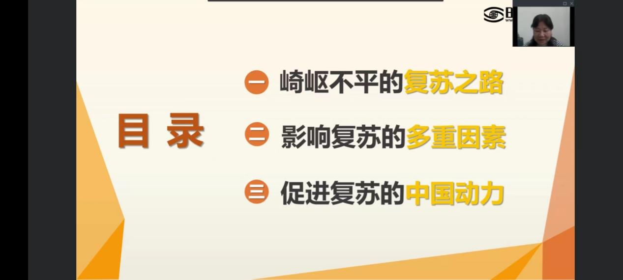 课上,蒋领敏主要从崎岖不平的复苏之路、影响复苏的多重因素、促进复苏的中国动力三个方面进行讲解。首先,蒋领敏讲到,在疫情的冲击下,人类社会遭遇了严重的经济衰退,发达经济体和发展中经济体复苏分化,供应链恢复遭遇逆风,通胀加剧贻害全球。为使通货膨胀率上升带来的影响更形象、具体,蒋领敏通过播放视频和举实例的方式为同学们深入讲解。接着,她讲到,全球疫情起伏不定,“逆全球化”思潮为世界经济发展带来了新的挑战,各国经济明显表现出随着疫情及防控形势而变化,我国餐饮业、旅游业都受到了影响。随后,蒋领敏讲到,中国在新冠疫情冲击和全球经济下行的压力中沉着应对、构建新发展格局、实现高质量发展,中国的经济正在稳中向好、持续稳定的恢复,中国很好的展示了在开放中更好的发展自己和造福世界的诚意与决心,中国方案、中国红利为抵御世界经济寒冬带来了光芒和温暖。中国也必将为世界贡献中国方案、中国力量。课程最后,蒋领敏以复旦大学张维为教授的视频结束,并以“天行健,君子以自强不息”勉励大家,希望同学们假期期间能做好疫情防控,做好个人规划、合理安排时间,不断提升、不断进步。