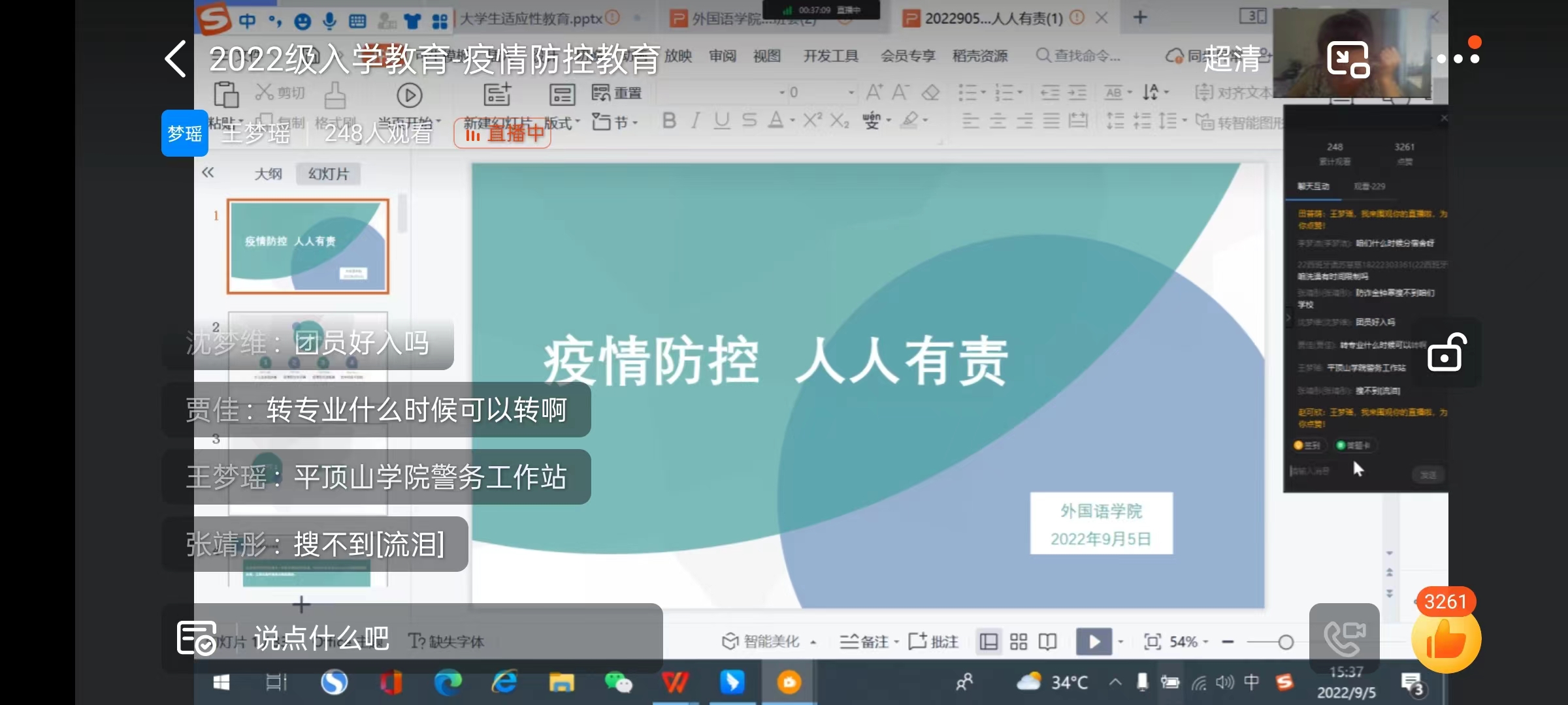 活动伊始,王梦瑶从新冠病毒的概念讲起,并向同学们介绍了新冠病毒的传播途径、感染后有何症状、哪些人容易感染新冠病毒和新冠病毒与普通感冒症状的区别等四方面的内容,她表示,希望同学们加强对新冠病毒的认识,进一步强化自身的疫情防控意识,加强个人的安全防护,保障个人身体健康。接着,王梦瑶面对当前复杂严峻的疫情防控态势,向同学们分享了常态化防疫措施,她讲到,同学们在返校前要尽量减少外出、不聚集、不扎堆,坚持科学佩戴口罩,做好日常的个人防护,同时王梦瑶鼓励同学们面对疫情,不恐慌、不惧怕,做好心理调适,保持一个良好的心态。最后,王梦瑶结合部分高校学生翻墙外出的事例,为同学们讲述了违反疫情防控规定的严重后果,要求同学们要严格落实当地的防控措施,遵守防疫规定,自觉核酸检测,按时健康报备,一定严格遵守纪律,维护好自身安全,一同努力打赢这场战“疫”!