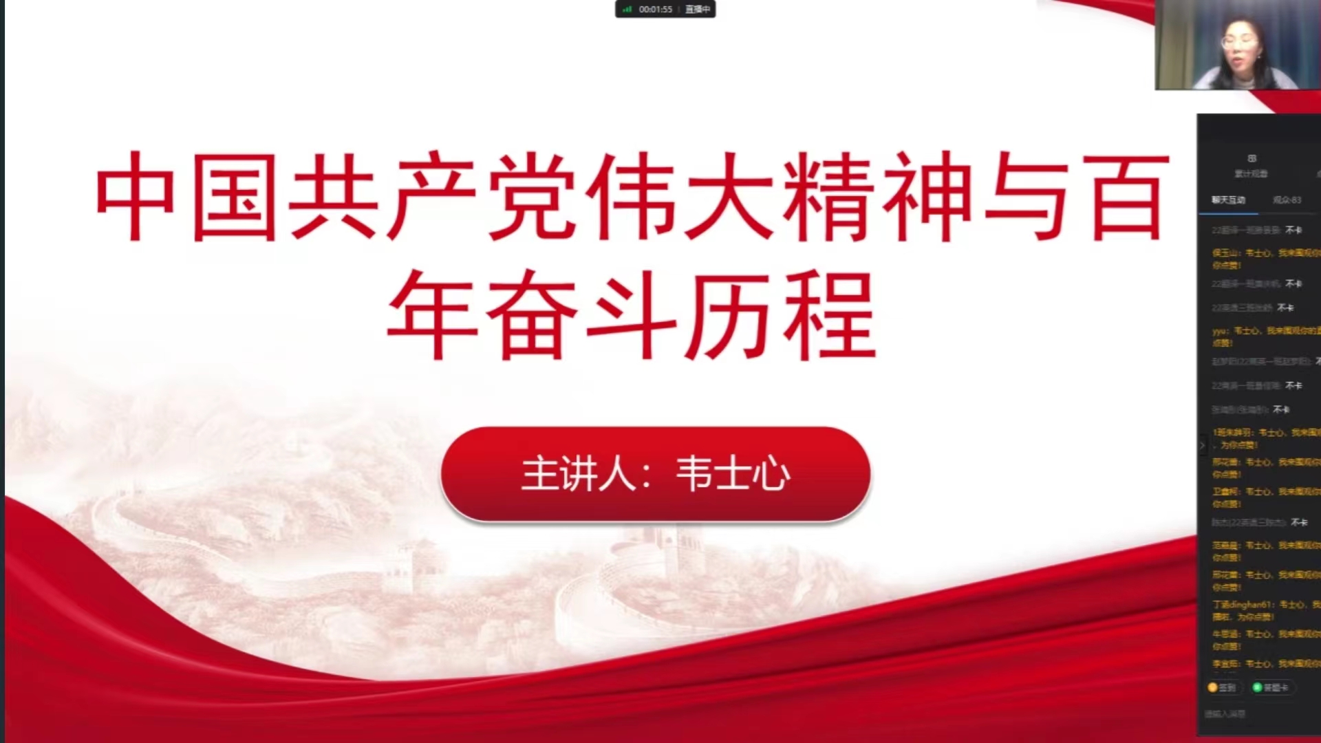 11月11日,韦士心带领大家全面回顾了中国共产党的百年奋斗历程与中国共产党伟大精神。她讲到,同学们作为当代青年学生,应该从党的百年奋斗历程中汲取奋进新征程的智慧和力量,为实现第二个百年奋斗目标、实现中华民族伟大复兴的中国梦不懈奋斗。接着,韦士心勉励同学们作为新时代青年,应该继续学习中国共产党的伟大精神,并将其继承下去,发扬光大。