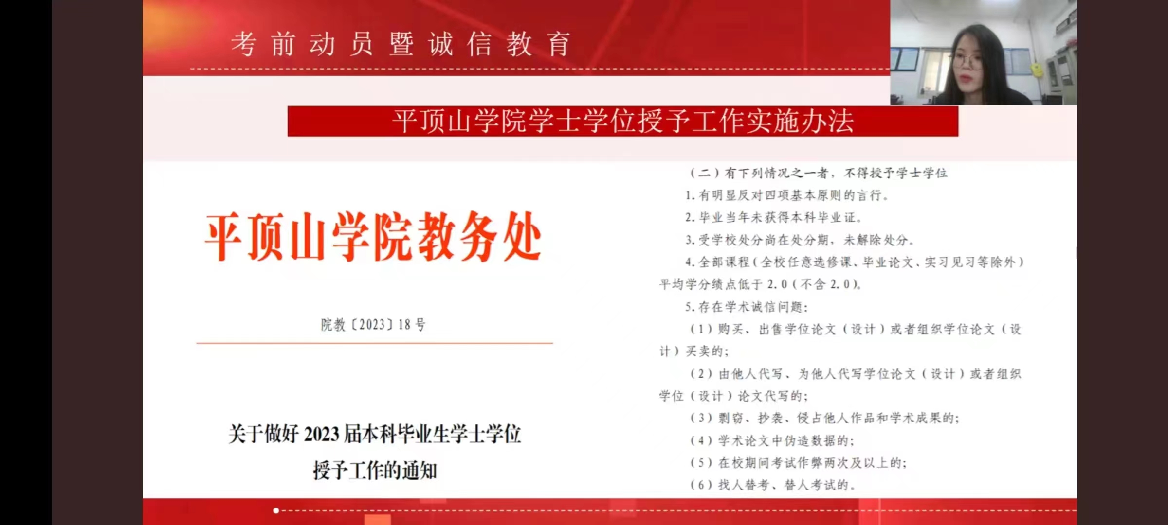 为严肃考风考纪,进一步增强学生诚信考试意识,提高学生思想道德素养,推动优良校风学风建设,6月25日下午,威廉williamhill通过线上的方式召开了考前动员暨诚信教育大会。本次大会由威廉williamhill辅导员石岩主持,威廉williamhill全体学生参加。