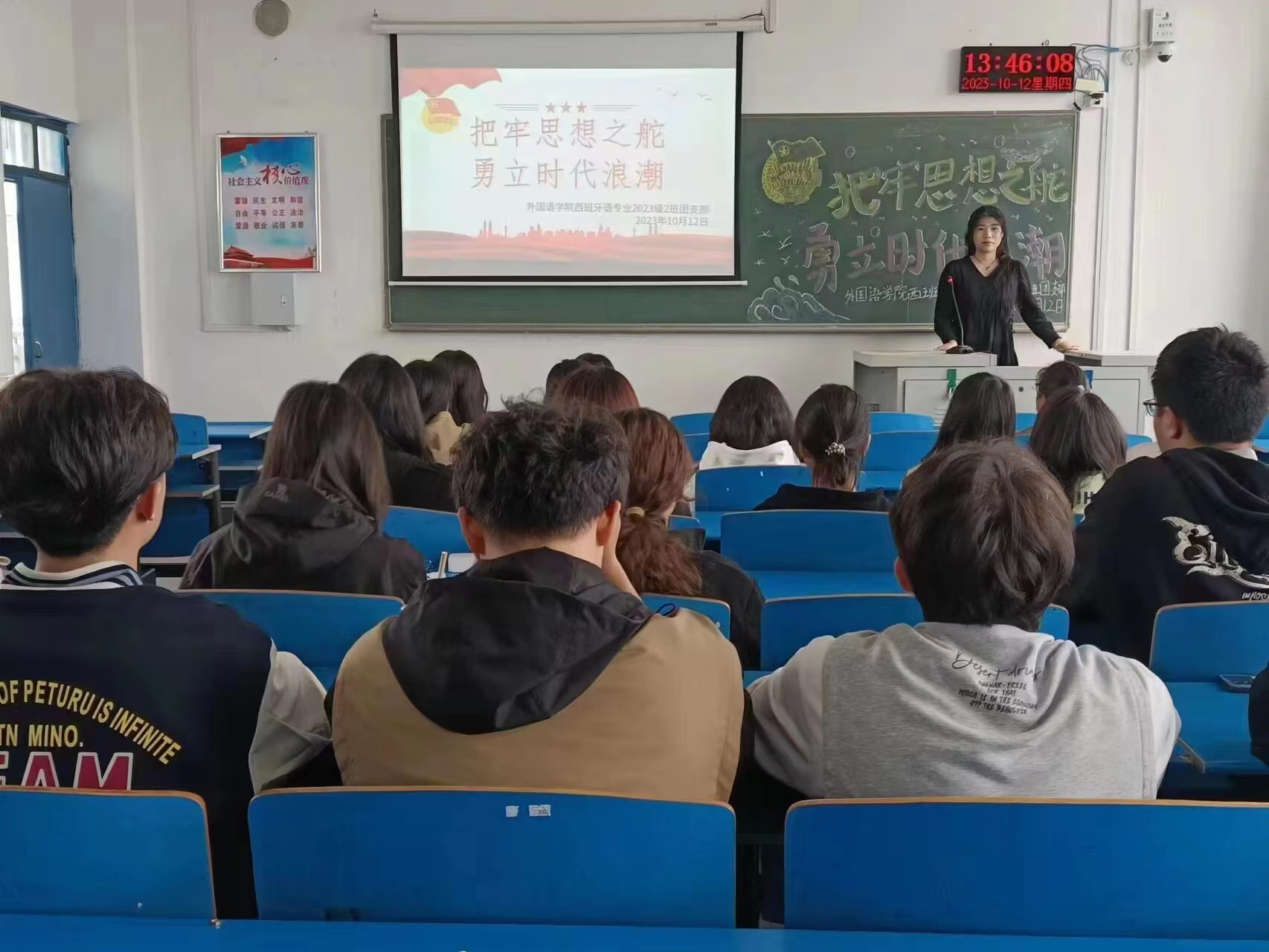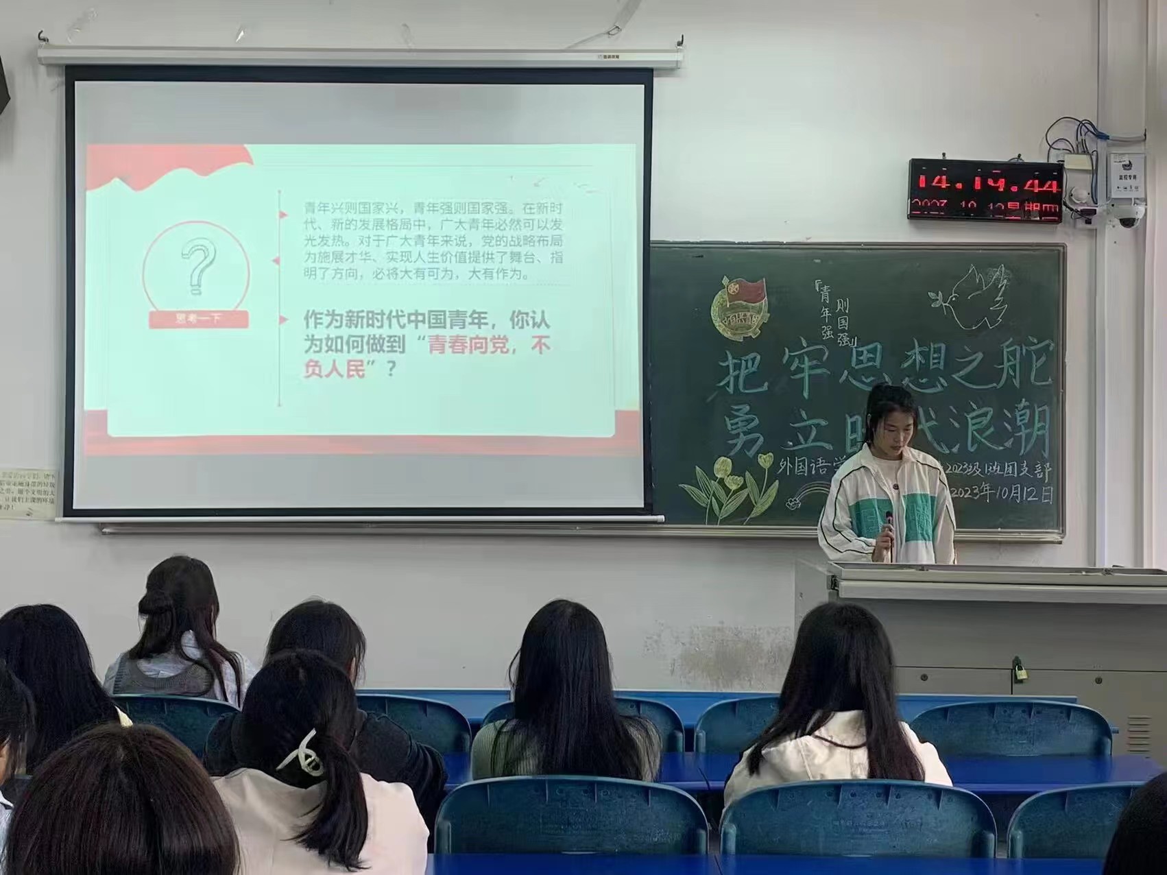 活动伊始,各支部团支书带领同学们重温了入团誓词并齐唱了中国共产主义青年团团歌,引导同学们从入团誓词与团歌中汲取精神力量,增强作为共青团员的责任感与担当意识。接着,各支部团支书结合《论党的青年工作》与同学们共同学习了关于“团结带领广大青年在实现中华民族伟大复兴的征程中续写新的光荣”的主题内容,并向同学们解读了党的工作内容与重心,鼓励同学们坚定理想信念,深刻理解党在青年工作中的地位和作用。最后,各支部团支书就国家每个阶段取得的伟大成果向同学们讲述了党的正确领导方针与政策,帮助同学们坚定了听党话、跟党走的信心和决心,激发了同学们对祖国的骄傲感与自豪感。同学们纷纷表示,在今后的学习与生活中会谨记前辈的经验和精神,努力学习专业知识,砥砺前行、奋发作为,不断攀登新的人生高度。