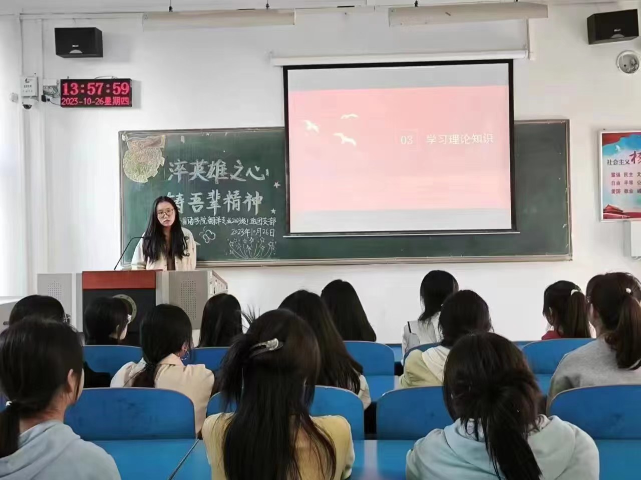 活动伊始,各支部团支书带领同学们齐唱了中国共产主义青年团团歌,并与同学们共同研读了共青团中央学习平台中的《高举中国特色社会主义伟大旗帜,为全面建设社会主义现代化国家而团结奋斗》篇章,帮助同学们深刻领悟习近平总书记的崇高思想,进一步加深对党创新理论的理解。接着,各支部团支书组织同学们观看了《我的抗美援朝》纪录片,分享了董存瑞、杨靖宇等英雄模范人物的事迹,他们强调到,同学们要以先进英雄模范为榜样,加强思想道德修养,并鼓励同学们传承红色基因,增强爱国意识和责任担当。随后,各支部团支书向同学们详细讲解了《中华人民共和国烈士保护法》和《中华人民共和国国家安全法》的相关内容,帮助同学们养成崇尚捍卫英雄烈士的行为规范,加强自身的责任感和使命感。最后,同学们纷纷表示,在今后的学习与生活中会牢记使命、发奋图强,为实现中华民族伟大复兴的中国梦贡献出自己的一份力量。