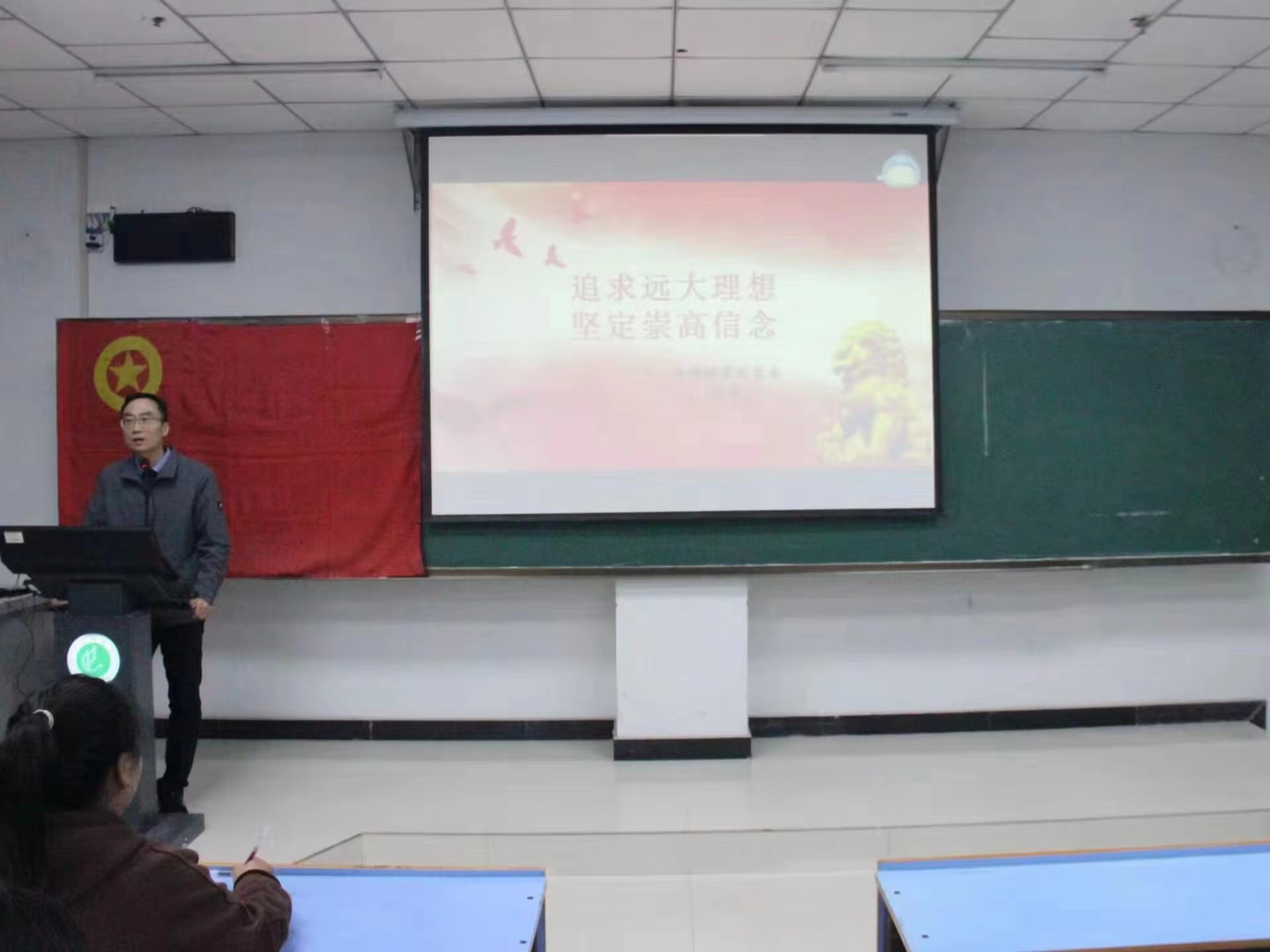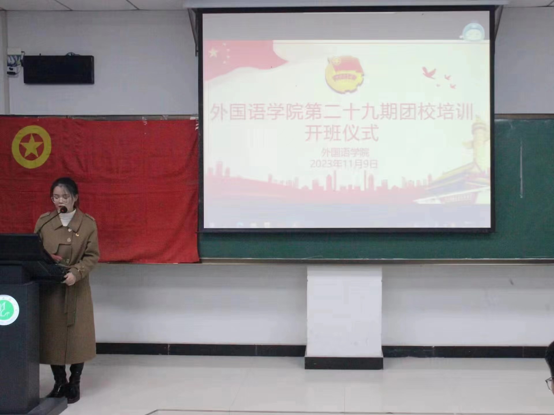 11月9日,培训在庄严的中国共产主义青年团团歌中拉开帷幕,石岩带领同学们重温入团誓词,并向同学们详细介绍了此次团校培训的课程安排和纪律要求。她讲到,团校培训是一次同学们锻炼自我、提升自我的好机会,希望大家能够课上认真听讲,以饱满的热情参加本次培训,争取有所收获。开班仪式结束后,甘泉以《追求远大理想,坚定崇高信念》为主题开始了此次团校培训的第一讲。他就“如何度过一个有意义的大学生活”这一话题与同学们分享了树立理想信念的重要性,并鼓励同学们认真思考,合理规划人生。敢于有梦、勇于追梦、勤于圆梦,做一名敢想敢做的大学生。