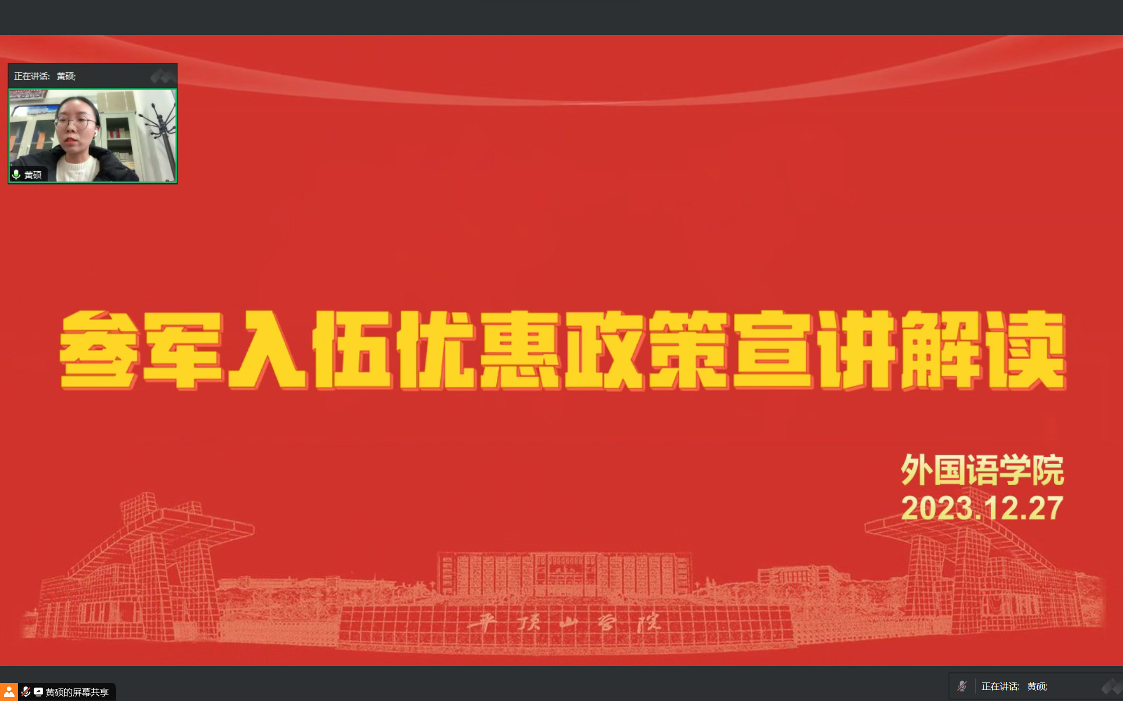 为积极响应国家征兵号召,进一步深化大学生对征兵工作的理解和认识,激励更多的学生主动参军入伍,12月27日上午,威廉williamhill于线上召开了参军入伍优惠政策宣讲会。本次宣讲会由威廉williamhill党委副书记田占范和2020级辅导员黄硕主讲,威廉williamhill2020级全体学生参加。