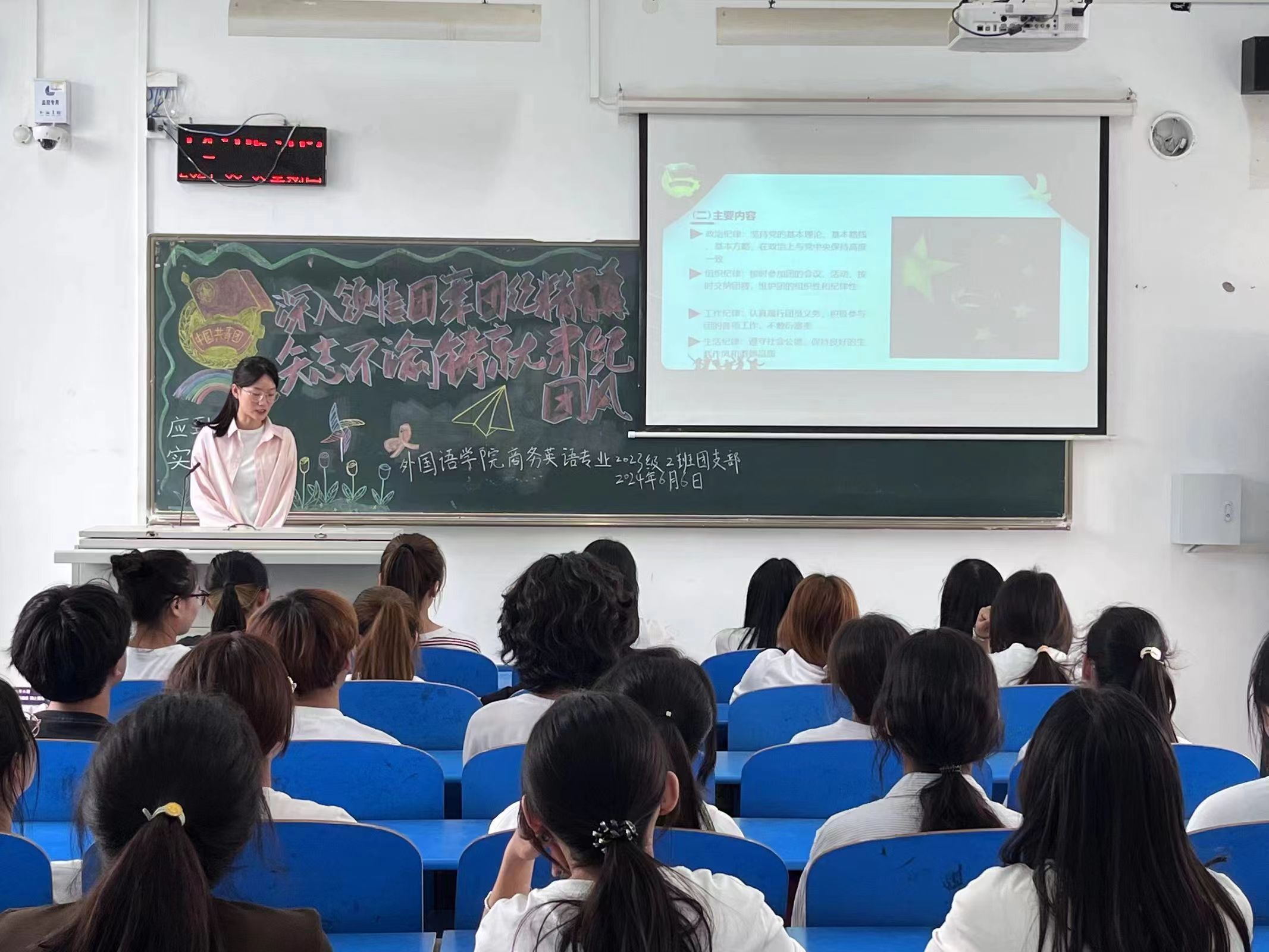 活动伊始,各支部团支书带领同学们齐唱了中国共产主义青年团团歌,并鼓励同学们坚定理想信念,保持积极向上的精神状态和良好的精神风貌。接着,各支部团支书带领同学们共同学习了《中国共产主义青年团章程》,深化同学们对团章团纪的理解,帮助同学们进一步明确了作为团员的责任和使命。最后,各支部团支书组织同学们学习了《中国共产主义青年团纪律处分条例(试行)》和《中国共产主义青年团团员教育管理工作条例(试行)》,并激励同学们严格规范自身的言行举止,为实现中华民族伟大复兴贡献青春力量。