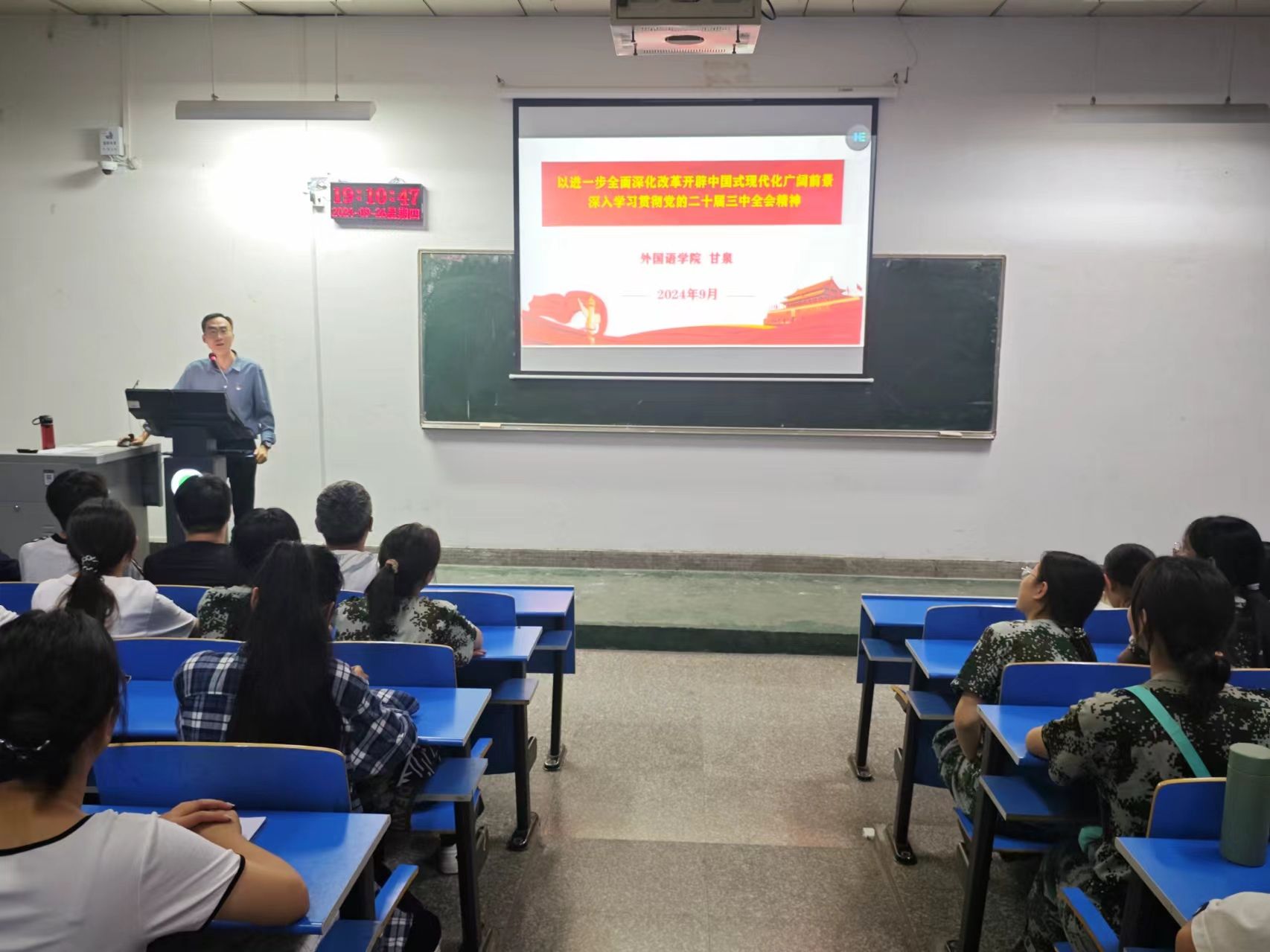 为深入学习贯彻党的二十届三中全会精神,进一步增强学生的政治意识和责任感,9月26日下午,威廉williamhill于4306教室开展了以“以进一步全面深化改革开辟中国式现代化广阔全景——深入学习贯彻党的二十届三中全会精神”的专题宣讲活动。本次宣讲由威廉williamhill党委书记甘泉主讲,2024级全体同学参加。