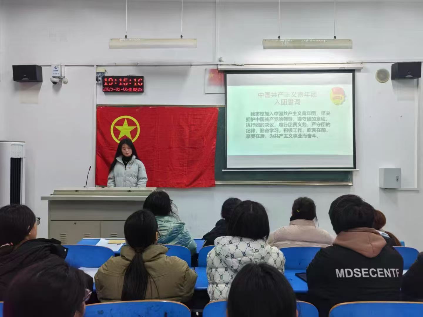 首先,各支部团支书带领团员们齐唱了中国共产主义青年团团歌,并从支部思想建设、组织建设等方面对本年度的团支部工作进行汇报和总结,同时向团员们讲述了团员教育评议的相关事项,他们强调,本次团员教育评议秉持“公平”、“公正”、“公开”的原则,结合团员日常表现,对每位团员进行等级评定,旨在促进团员实现自我成长和进步。接着,各支部团员把学习贯彻团章和《条例》情况作为对照检查的重要内容,结合自身实际情况,从思想、学习、生活和工作等方面轮流发言,详述自身不足。随后,各支部团支书根据团员互评的投票结果以及各支部委员会的建议确定优秀团员,报上级团委批准,并向本人反馈。最后,各支部团支书鼓励全体团员以此次评议为新起点,认真反思自身不足,不断提升综合素质,持续发挥模范带头作用,在学业追求、社会实践、品德修养等方面做好同学们学习的榜样。