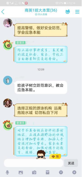 此次活动中,各辅导员向同学们讲述了近期内发生的溺水事件,引起大家对防溺水的高度重视,并反复叮嘱同学们在家期间也要提高警惕,做好安全防范。此外,各班班长也向同学们分析了生活中存在的溺水隐患,提醒同学们做好安全防护,同时,还向大家介绍了预防溺水常识和溺水救护方法等各类安全知识,帮助同学们提高避险防灾和自救能力。同学们也针对溺水问题展开了讨论,发表了自己的感想。