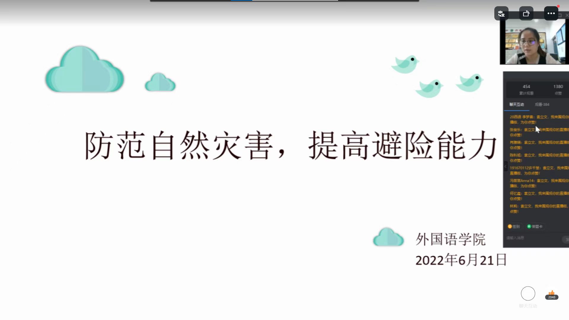会议伊始,袁立文通过列举近期频发的暴雨、高温等问题,强调了夏季属于洪水、火灾等自然灾害的高发季节,建议同学们要掌握正确的防范措施,全面了解保护自身安全的方法,同时提醒大家时刻关注天气预报,及时做好高温预防措施。接着,袁立文结合图片和视频生动地为大家讲解了地震、火灾、雷电、洪水和泥石流等自然灾害发生时的应急、自救要诀和互救常识,帮助同学们分析如何在遇到灾害时最大程度的保护自身安全。她讲到,同学们在遇到紧急情况时要沉着冷静,保持良好心态,果断分析并作出判断,千万不可惊慌失措或存有侥幸心理,心中要时刻保持危机意识。最后,袁立文建议同学们在假期生活中也要保持健康作息,学习不松懈,注意保持身体和心理的健康。
