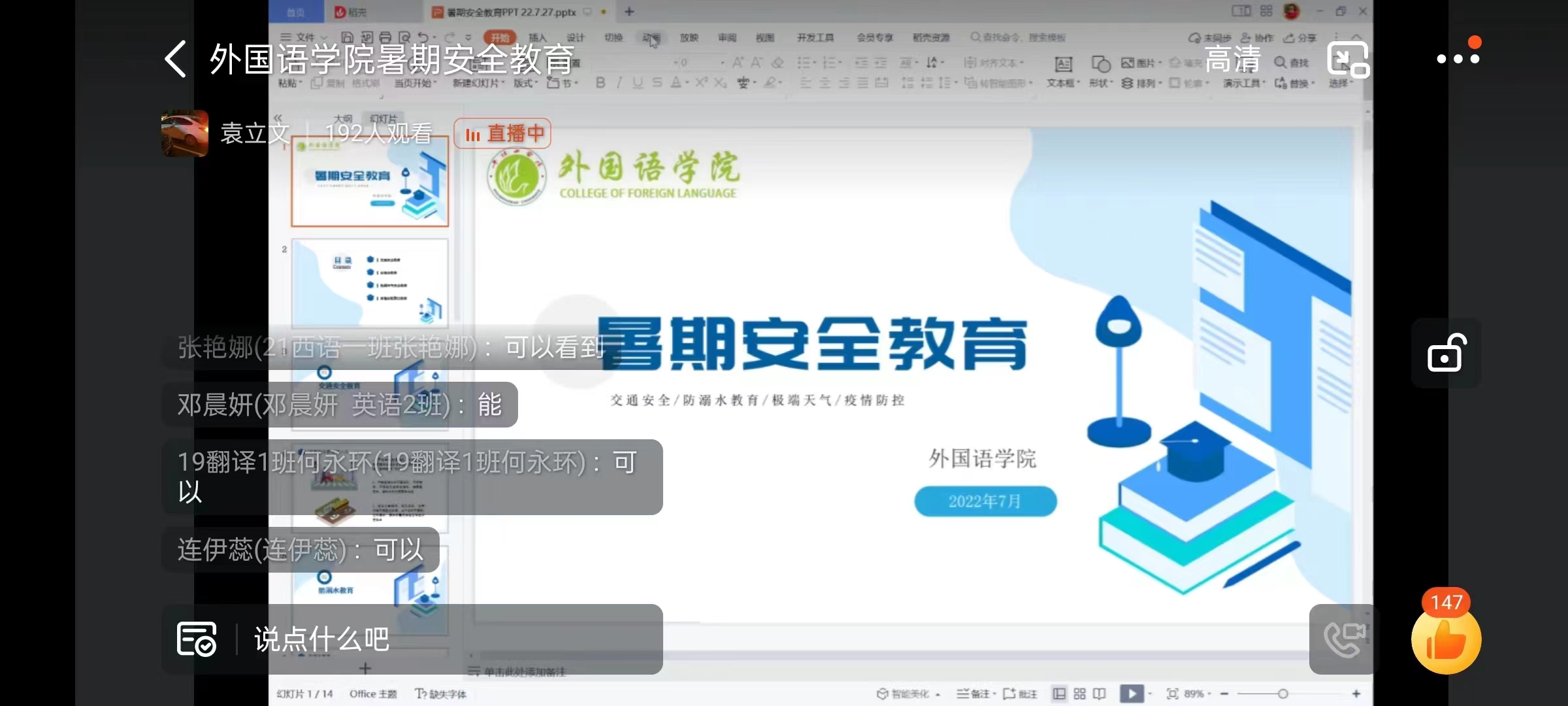班会伊始,袁立文从交通安全讲起,她提到,暑假期间,大学生探亲访友、进行长途旅行等外出活动大幅增多。当前交通环境日益复杂、行人走路看手机、随意横穿马路等行为带来的悲剧仍不时发生,因此,她呼吁同学们要遵守交通法规、文明出行。接着,她针对近期频发的暴雨、高温等气候现象,嘱咐同学们要注意极端天气,面对高温,不要随意外出游泳,珍爱生命,谨防溺水,面对暴雨等其他极端天气情况,多掌握一些自救知识,以便在遇到灾害时最大程度地保证人身安全。随后,她再次强调疫情防控的重要性,并叮嘱同学们跨省出游一定要提前报备,同时做好防护措施,时刻保持警惕,保证人身安全。最后,她希望同学们能时刻将“安全无小事,生命重泰山”这一原则牢记心间,无论在哪里都要重视安全问题。同时,她建议同学们在家中能够多和家长沟通交流,在力所能及的情况下多帮父母做一些家务,合理分配自己的时间,做好暑期规划。