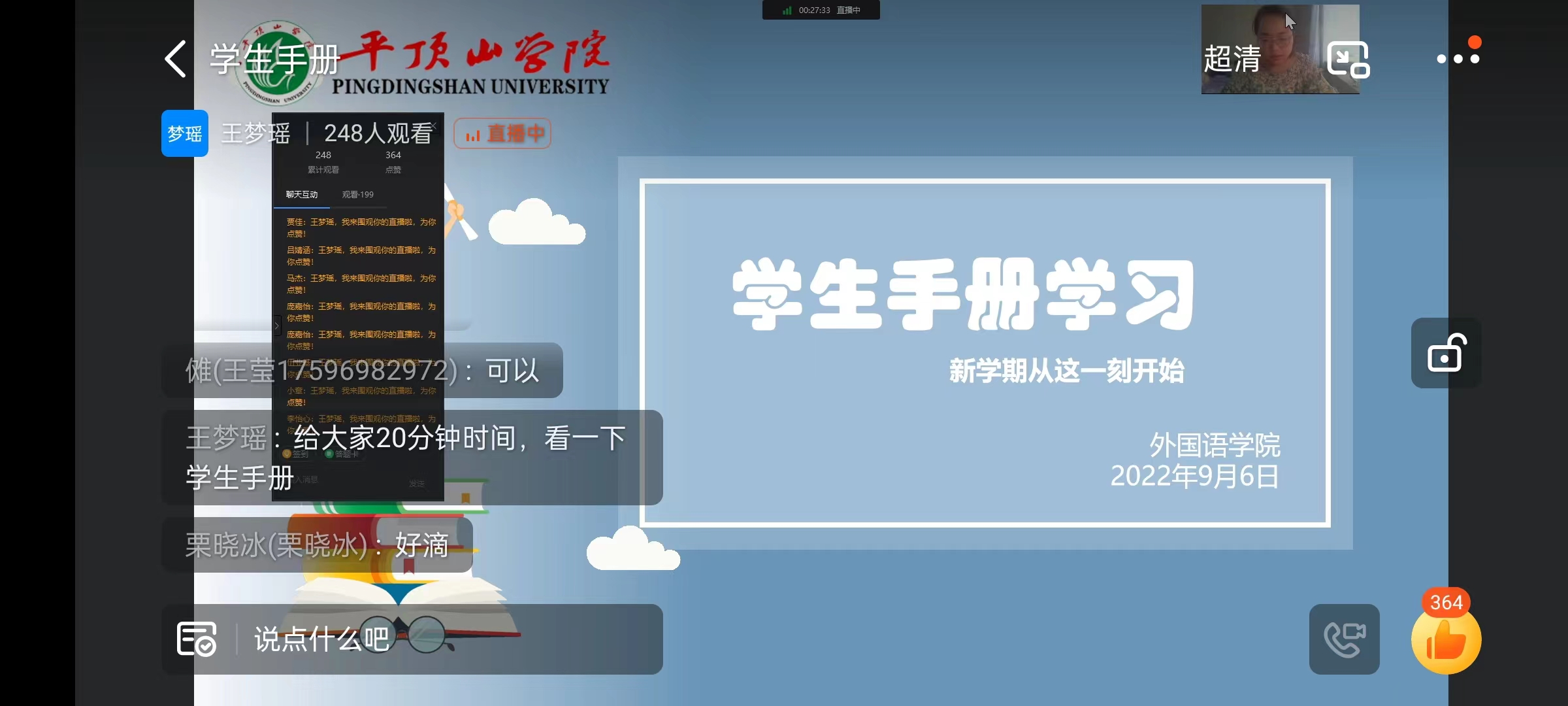 为进一步加强学生思想文明教育,提高学生个人素质,规范学生个人行为,9月6日,威廉williamhill通过钉钉直播的方式,组织新生学习学生手册。本次学习由威廉williamhill辅导员王梦瑶带领,全体新生参加。