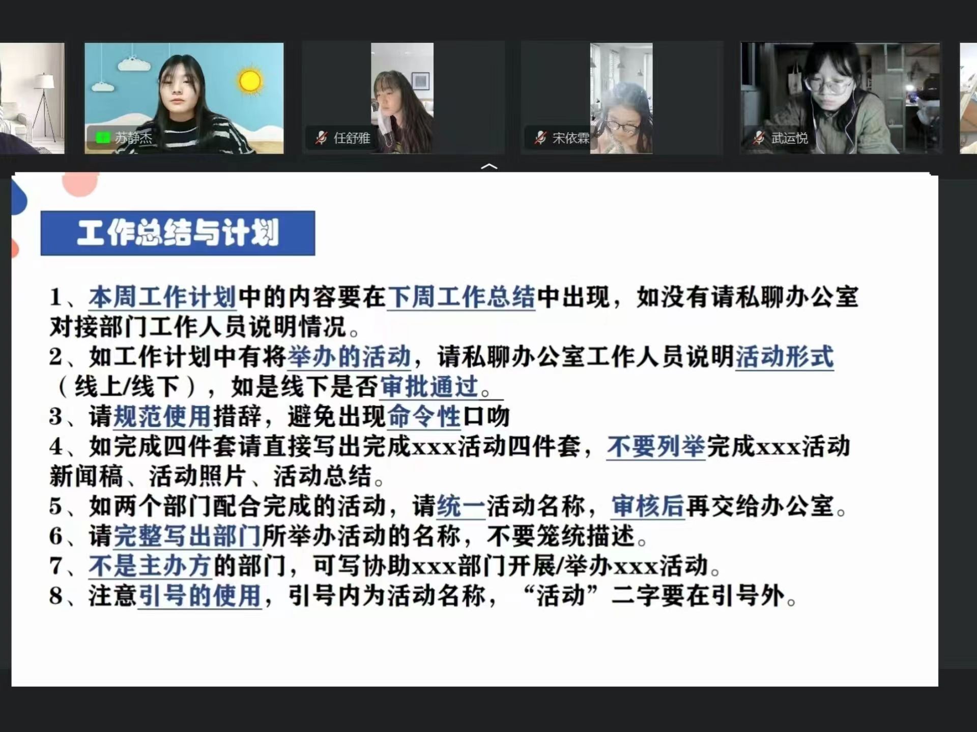 会议伊始,孙肖寒详细讲解了学生会开展活动所需的四件套格式规范,强调同学们要严格按照格式整理工作四件套,提升工作质量,从而有序地推进后续的工作。接着,苏静杰向同学们介绍了工作总结与工作计划的撰写标准,并讲述了值班工作和会议记录的具体要求,提醒同学们明确工作职责,规范自己的行事作风,为今后提升工作效率和工作质量打下坚实的基础。在新闻方面,王坤元在新闻稿格式规范、书写框架以及注意事项等方面为同学们进行了详细的指导,并向同学们分享了新闻稿的写作技巧,让同学们对新闻稿写作有了进一步的了解。最后,苏静杰表示希望各部门工作人员能尽快适应部门工作,不断提升自身能力,将学习成果应用于实践并锤炼工作作风,为今后践行代表同学、服务同学的宗旨打下坚实基础。