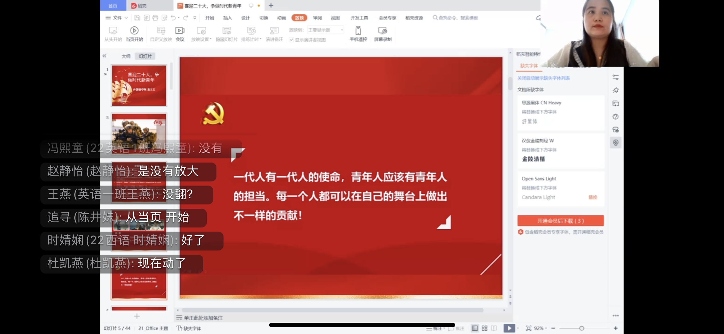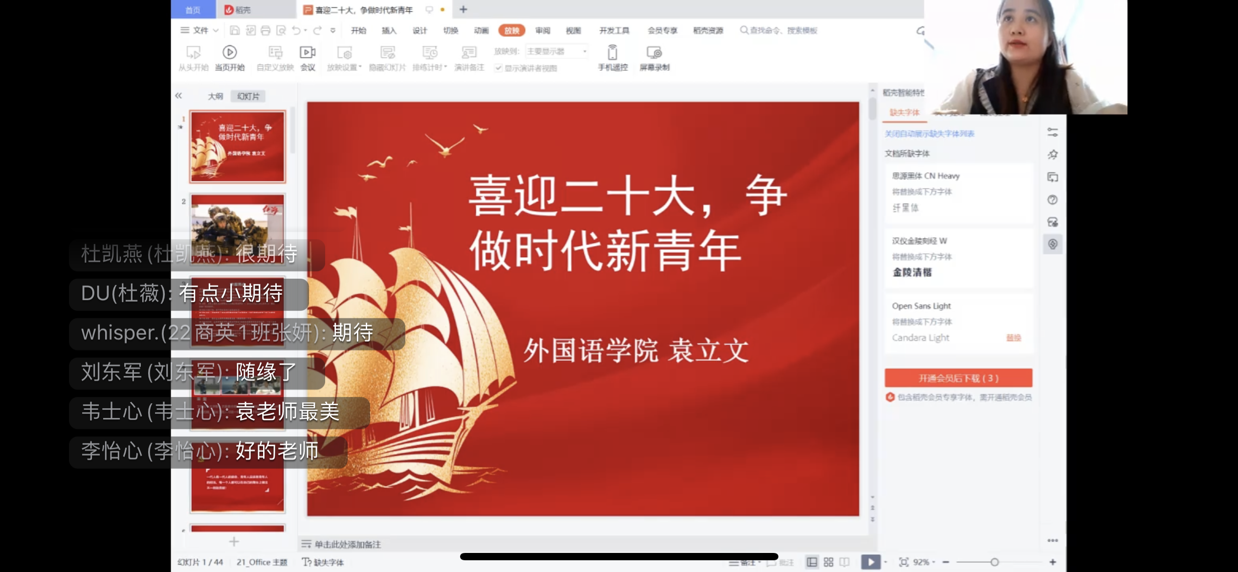 为厚植爱国主义情怀,加强新时代爱国主义教育,增强学生的爱国主义情怀,坚定理想信念,牢记初心使命,树立正确的人生观、价值观、世界观,9月7日上午,外国语学院通过钉钉直播的方式,开展主题为“喜迎二十大,争做时代新青年”入学教育讲座。本次讲座由威廉williamhill团委书记袁立文主讲,2022级全体新生参加。