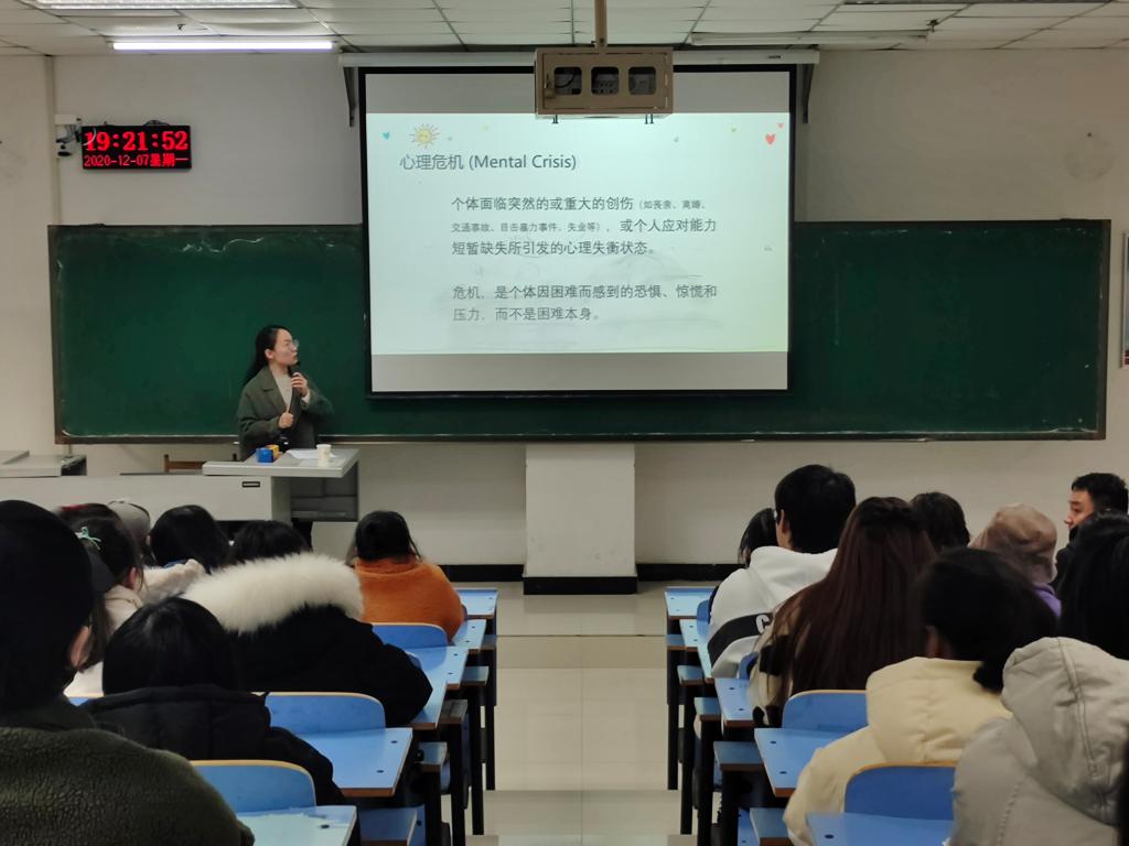 讲座伊始,范老师首先播放了一段舒缓的轻音乐,通过音乐冥想的方法引导学生们渐渐放松身心,在一定程度上缓解了同学们的学习和生活压力,也使同学们认识到如何通过音乐冥想等方式缓解日常心理情绪的作用。接着,范老师向同学们介绍了心理危机的概念、反应、影响因素、应对方法及干预措施等内容,帮助同学们进一步了解心理危机。在谈到如何与出现心理危机的同学交谈时,范老师向大家强调了两点,一是应该用“同理心”的方法去了解他,降低其孤独感;二是要接纳对方的感受,鼓励他选择其他方式解决问题,走出危机。最后,陶老师也向同学们分享了身边的案例,并提醒同学们重视心理健康教育,学会用正确的方法缓解不良情绪,遇到问题要及时主动的寻求帮助。