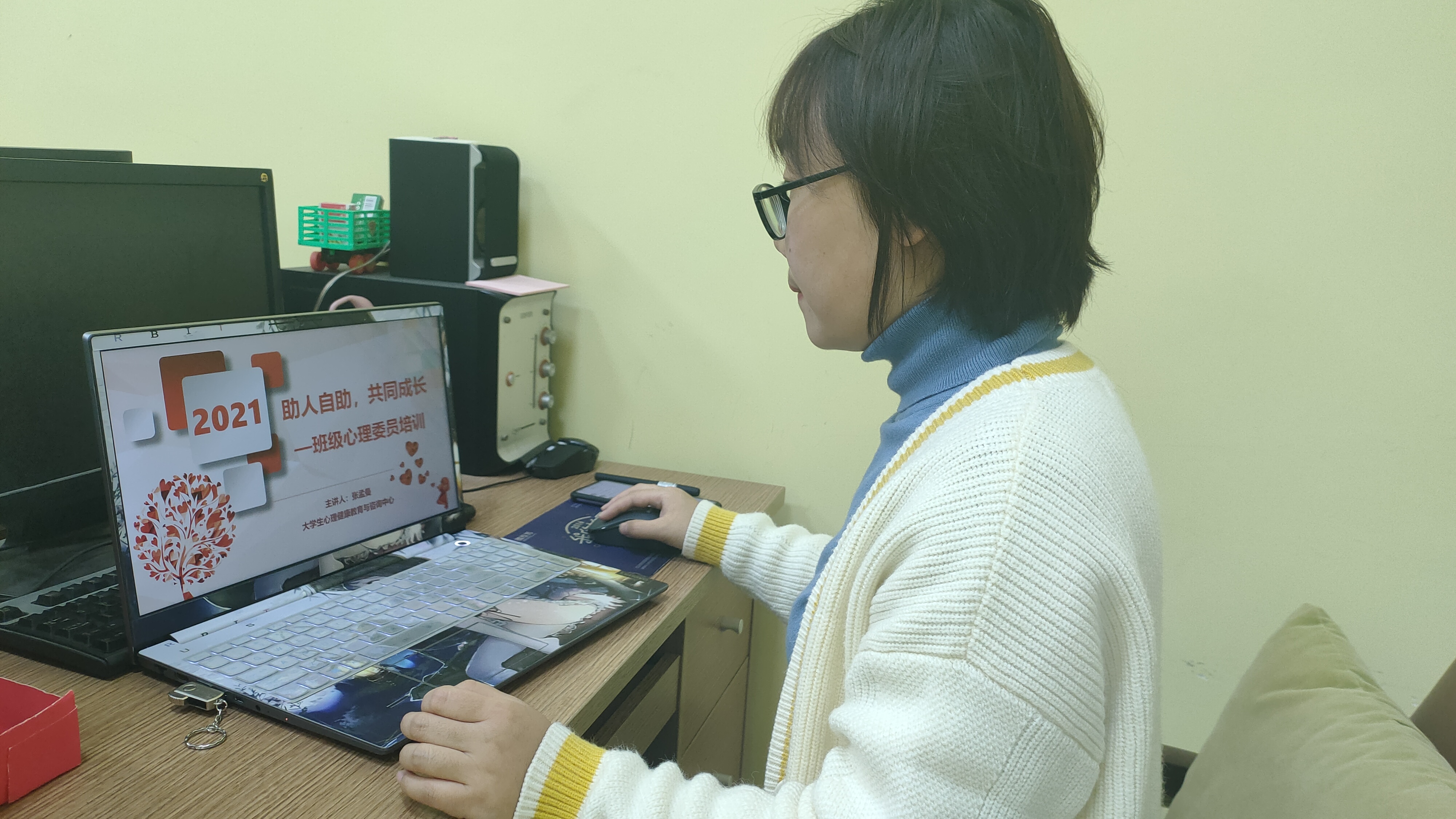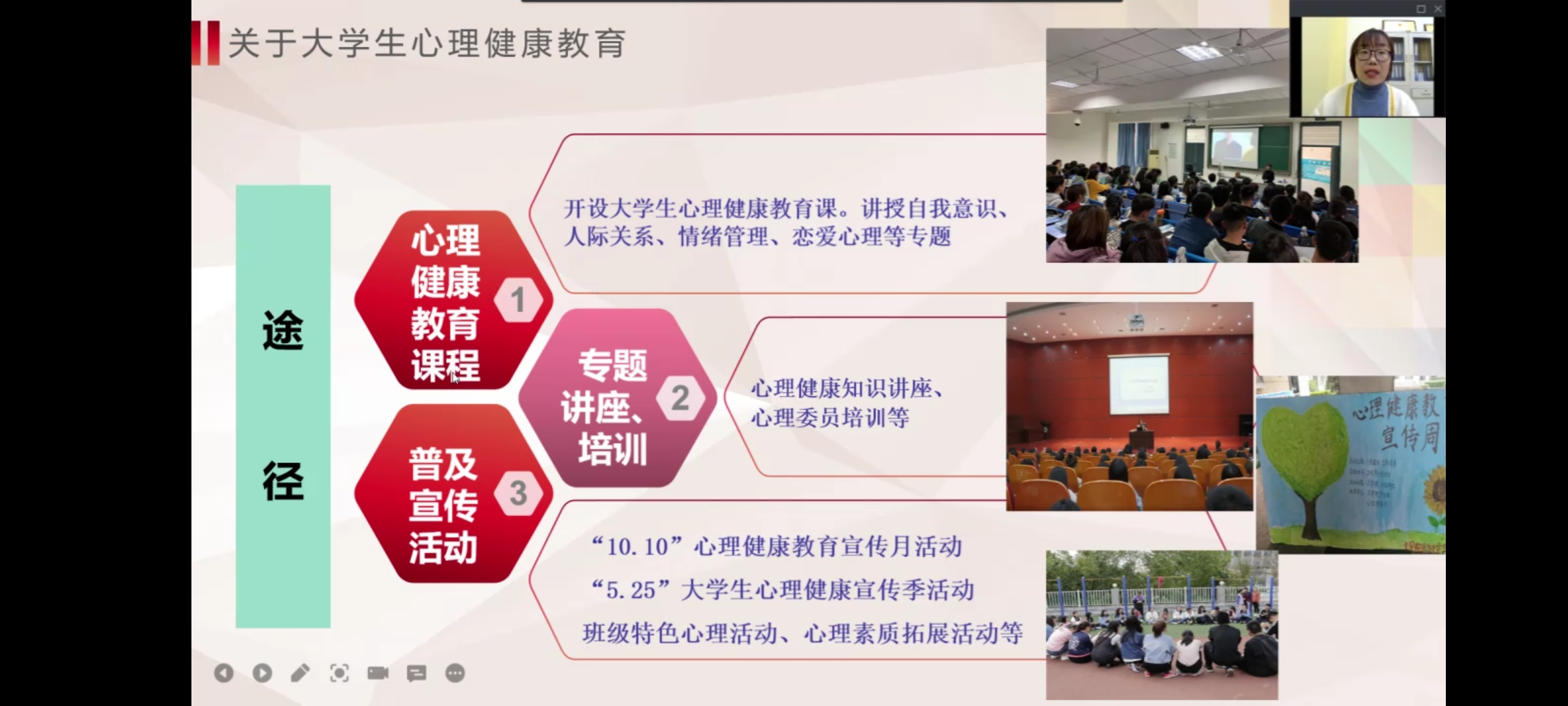 培训伊始,张孟曼首先向同学们介绍了我校学校、学院、班级及宿舍四位一体的心理健康教育服务体系,并向同学们介绍了我校大学生心理健康教育与咨询中心。接着,张孟曼从“班里心理委员角色”、“如何做好心理委员工作”、“心理委员的自我防护”等三个方面为主要内容展开了本次心理健康培训。培训中,张孟曼指明了心理委员在班中所担任的角色以及主要任务与职责,并向同学们分享了我校以往所开展的心理健康教育活动。最后,张孟曼对大学生心理危机干预知识技能进行了重点讲解和培训。