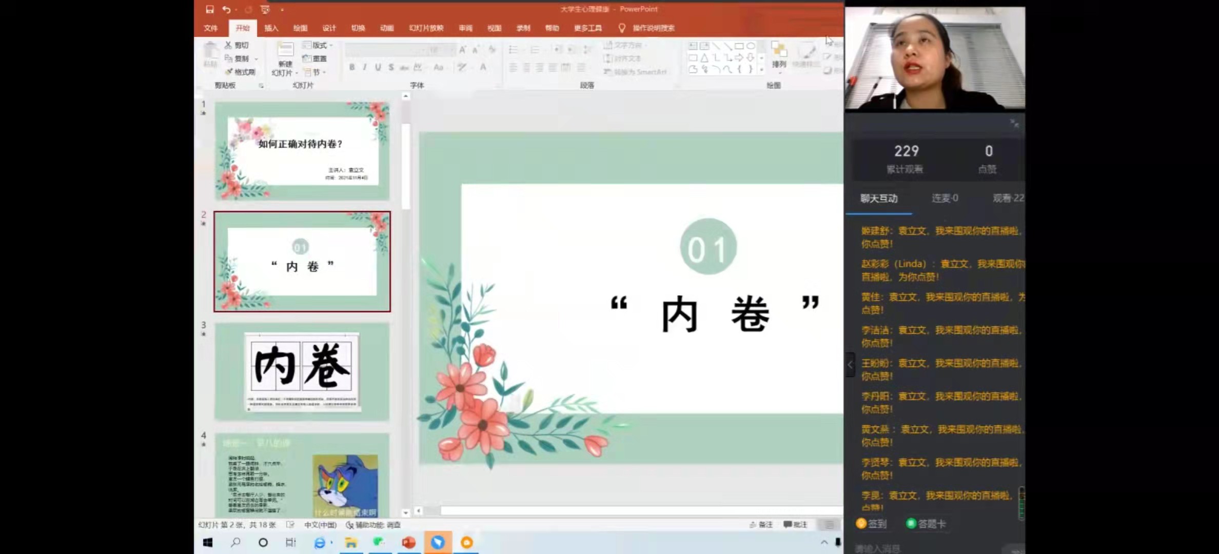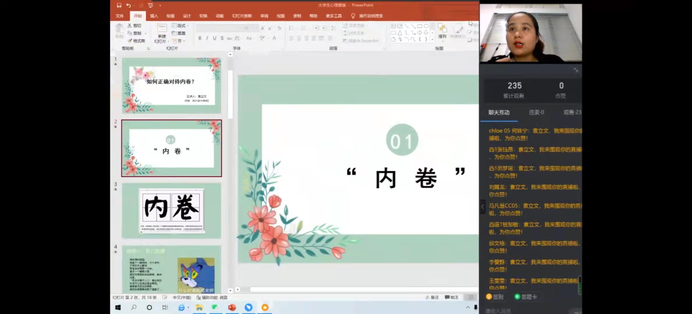 袁立文从近期引发热议的“内卷”一词出发,结合实际从多个场景向同学们解释了“内卷”的含义,提醒同学们要始终保持良好的学习心态,正确看待“内卷”。同时,为了帮助同学们减轻学习和竞争造成的压力,袁立文提出了三条建议:一是要树立坚定目标,制定明确计划;二是深入实践,谨慎选择;三是接受竞争,退出内卷。接着,袁立文又讲到,同学们要对自己的学习和未来有所规划,做到一步一个脚印,脚踏实地,注重坚持,规划好学习计划,充实自己的大学生活。最后,袁立文向同学们强调了疫情防控期间的注意事项,叮嘱同学们在疫情期间做好防护措施,非必要不外出。
