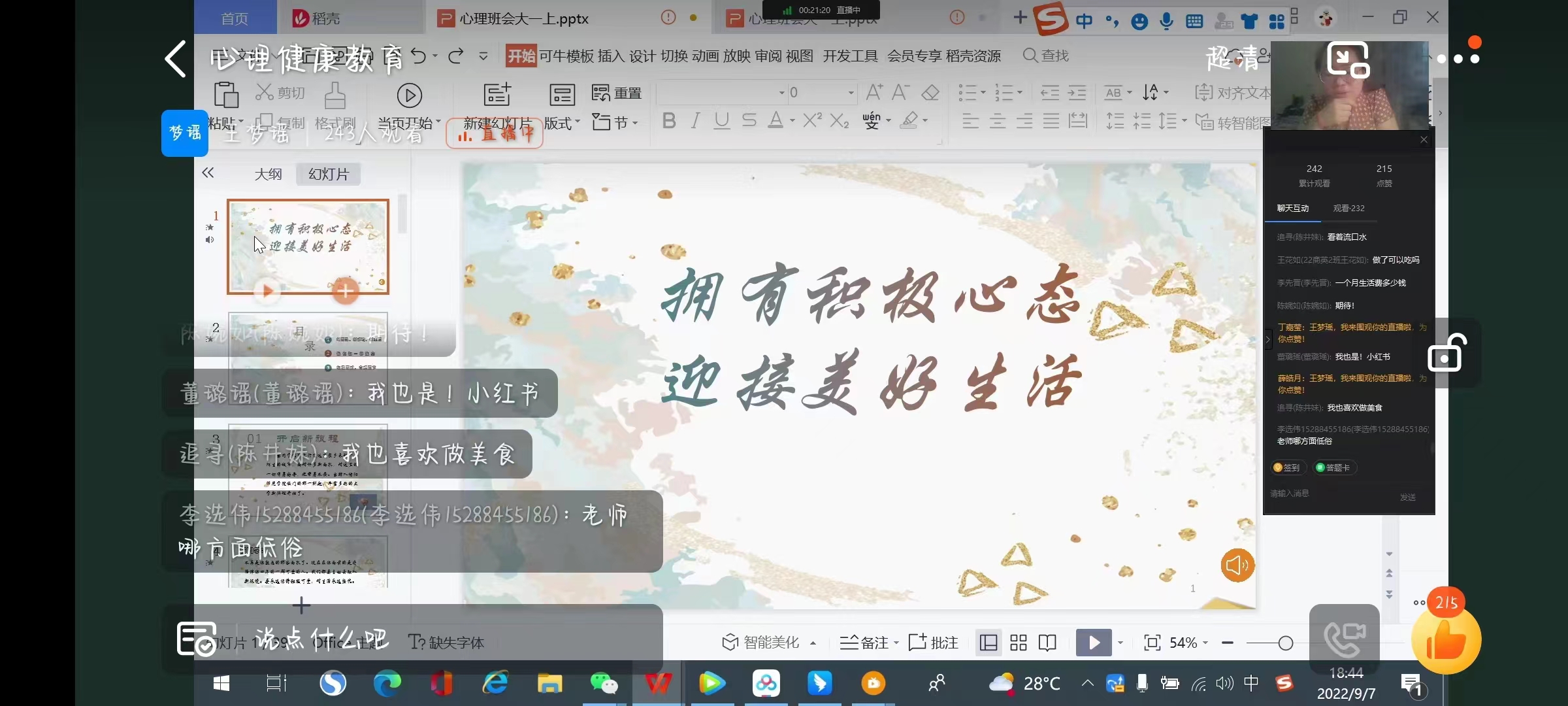 为了帮助新生尽快适应大学生活,疏解成长压力,提高新生的心理素质,9月7日下午,威廉williamhill面向2022级新生开展了以“拥有积极心态,迎接美好生活”为主题的心理健康教育讲座。本次讲座由威廉williamhill辅导员王梦瑶主讲,威廉williamhill全体2022级学生参加。