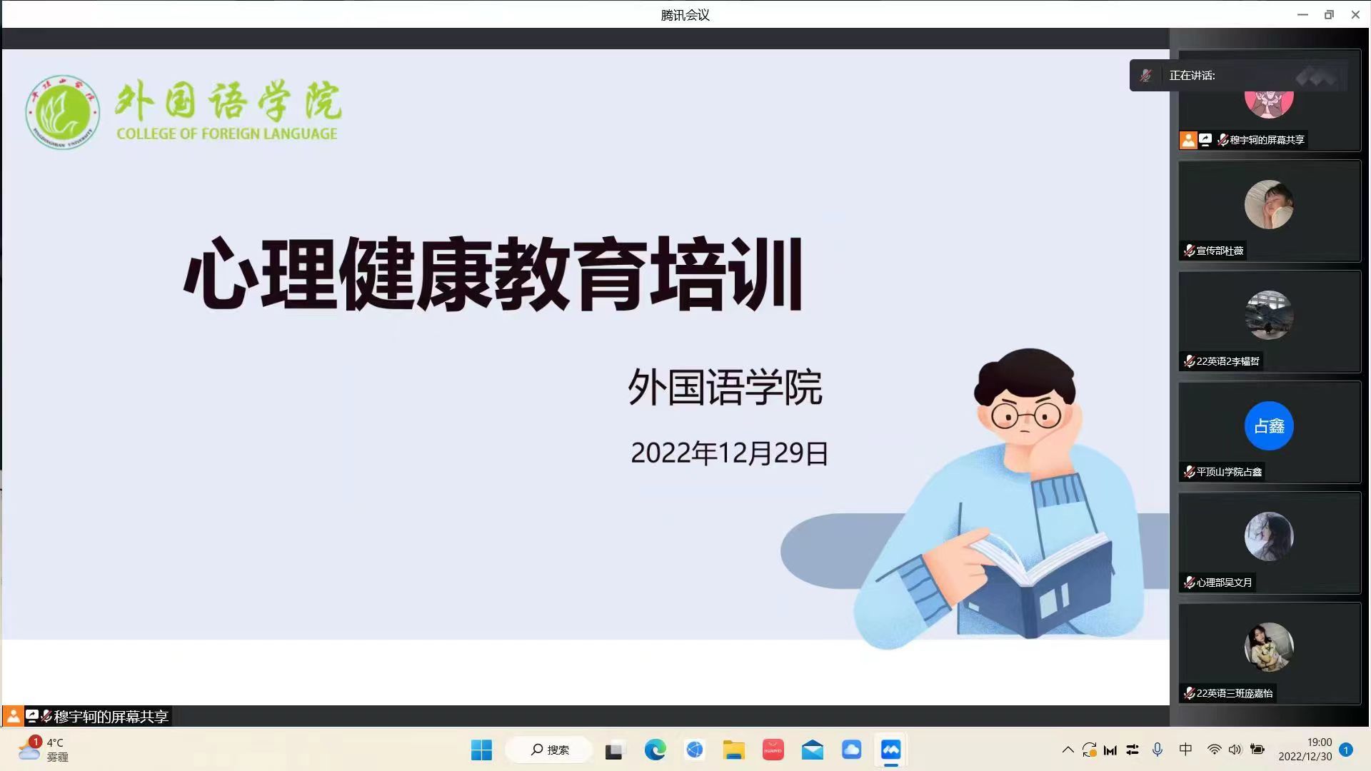 为进一步加强威廉williamhill各班心理委员对心理健康教育工作的了解,更好地配合院系推进心理健康活动,12月29日下午,威廉williamhill团委于线上开展了心理健康教育培训会。此次培训会由威廉williamhill团委心理部负责人穆宇轲、占鑫主讲,威廉williamhill各班心理委员参加。